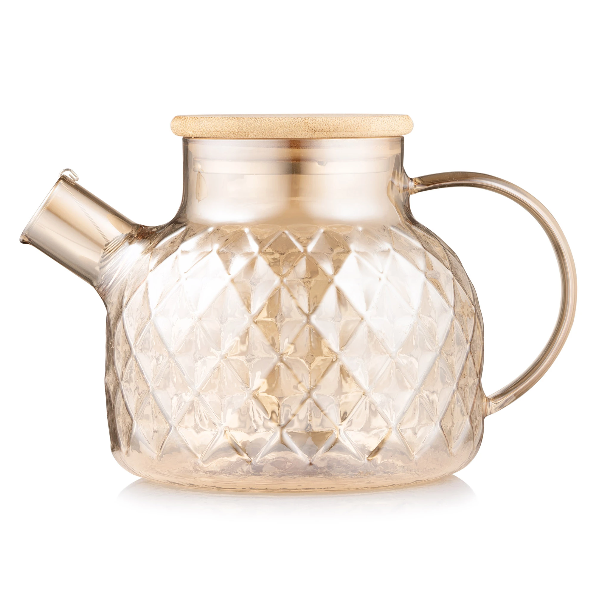 Заварник виготовлено з екологічного матеріалу – боросилікатного скла, яке не вбирає запахів, тому смак напою завжди залишатиметься незмінним. Матеріал вирізняється міцністю і стійкістю до перепадів температури, тож тривалий термін слугування і безпечне використання виробу гарантовано. Бамбукова кришка та золотистий відтінок скла додають виробу ноток розкоші. Об’єм моделі становить 1 000 мл. Це ліпший вибір для сімейних обідів, вечірок з друзями або для використання в офісі. Заварник згодиться для різних видів плит (газових, електричних, склокерамічних, галогенних), його можна підігрівати на помірному вогні та мити в посудомийній машині (крім бамбукової кришки).