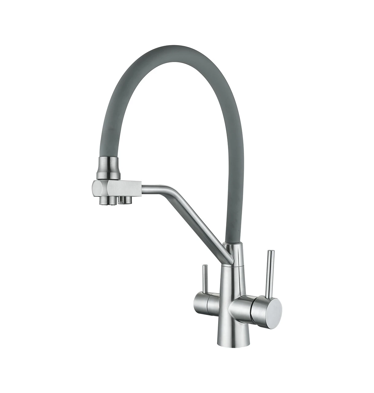 Матеріал: харчова нержавіюча сталь марки SUS304. Тип корпуса: двоважільний. Вилив: високий, поворотний, гнучкий. Висота змішувача: 45 см.  Комплектація: змішувач, кріплення, шланги для підводу води 50 см.