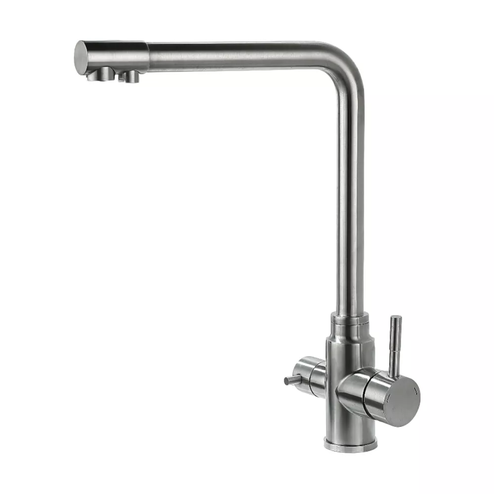 Матеріал: харчова нержавіюча сталь марки SUS304. Тип корпуса: одноважільний. Вилив: високий, поворотний. Висота змішувача: 26 см. Довжина виливу: 17 см. Комплектація: змішувач, кріплення, шланги для підводу води 50 см.