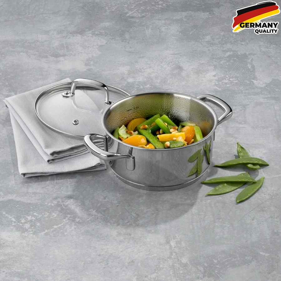Ця компактна каструлька створена виключно для довготривалої і надійної служби своїм власникам. Посуд виконаний з міцної нержавіючої сталі 18/10. Даний матеріал має тільки позитивні характеристики. По-перше - він легко миється як з внутрішнього, так і з зовнішнього боку приладу. По-друге - продукти в посуді з даного матеріалу не пригоряють. По-третє – нержавіюча сталь 18/10 витримує високі температури в 220 градусів без кришки і 180 градусів зі скляною кришкою, яка йде в комплекті з каструлею. По-четверте - матеріал не вбирає в себе запахи і смаки, гарантуючи збереження всіх якостей страви, яку готують в посуді. Обсягу в 1,2 л досить для приготування як наприклад манної каші, так і ароматного рагу до вечері, для кількох людей.