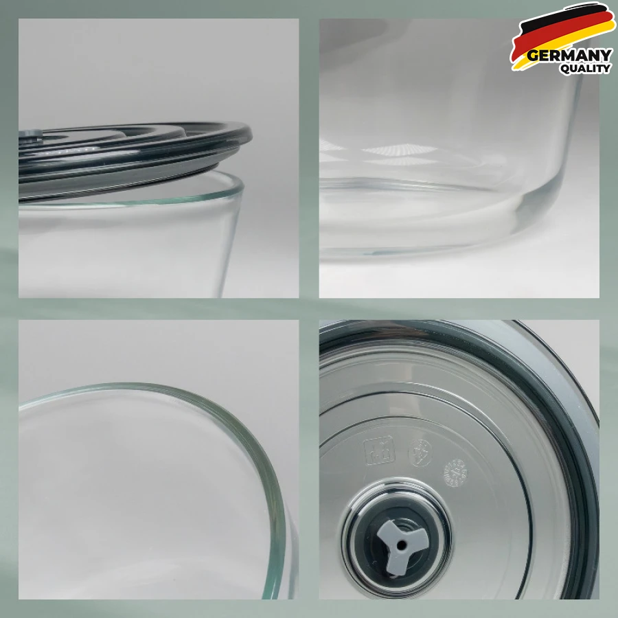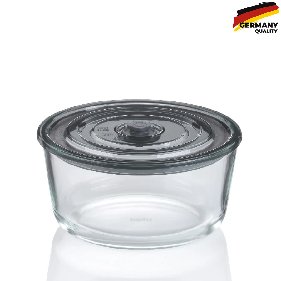 - Пластикова кришка має вбудовану кнопку. Легке натискання створює вакуум (система Push & Go), який щільно притискає кришку до банку. Це забезпечує герметичність вмісту, відсутність запаху та повітронепроникності.