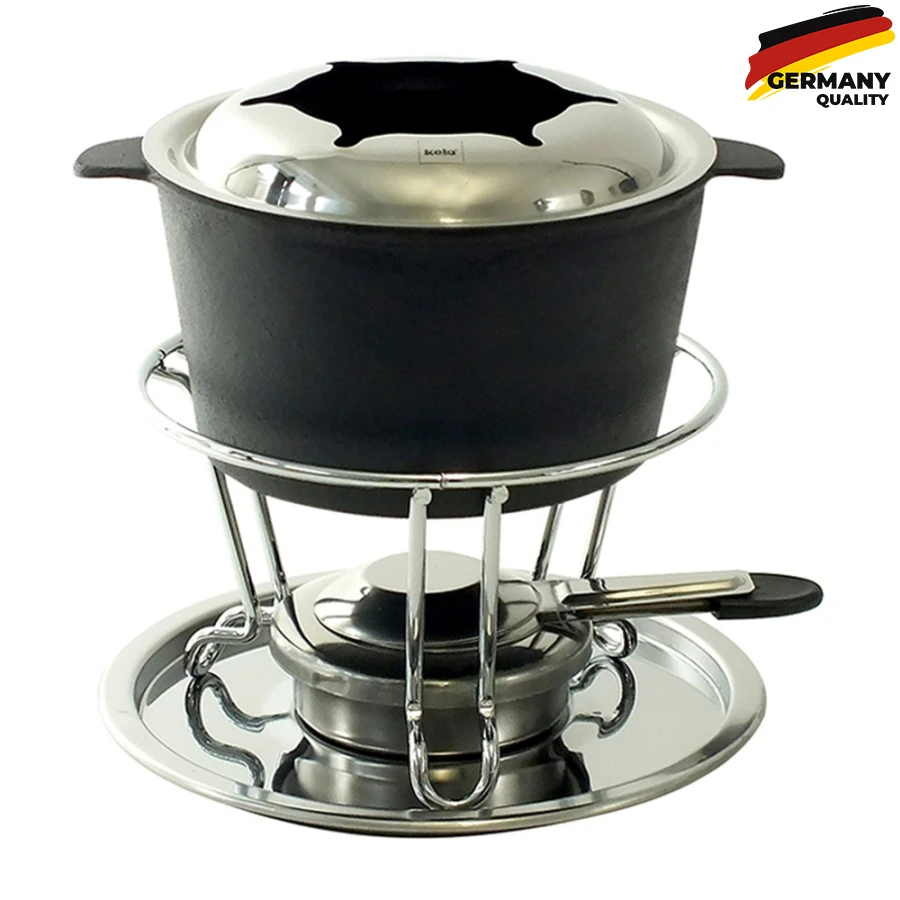 Набір для фондю KELA Comore включає в себе 11 предметів: каструля для фондю з чавуну, покрита чорною емаллю (1 шт), підставка з нержавіючої сталі (1 шт), захисна кришка з нержавіючої сталі (1 шт), пальник (1 шт), нагрівач з хромованого металу (1 шт), вилки для фондю з нержавіючої сталі (6 шт).