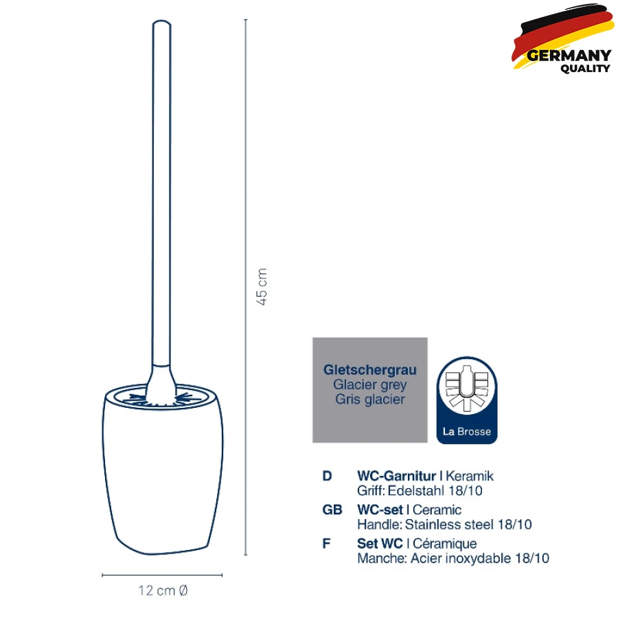 Сучасний туалетний гарнітур у ретро-стилі. Туалетні набори Landora & Lindano виконані в білому кольорі всередині і в льодовиково-сірому кольорі, або в кольорі палісандра зовні. При висоті 45 см вони не займають дуже багато місця. Ручка щітки виготовлена із високоякісної нержавіючої сталі і, як і сама щітка La Brosse, може бути замінена та перезамовлена. У цій великій серії для ванних кімнат ви знайдете відповідні аксесуари (дозатори для мила, чашки, мильниці), а також красивий текстиль для ванної різних розмірів. Підходящий запасний пензель ви можете знайти під артикулом 20140, кисть-ручка + пензель має артикул 20145. Ручка доступна в матовому або глянсовому виконанні, а також з білим або чорним пензлем.