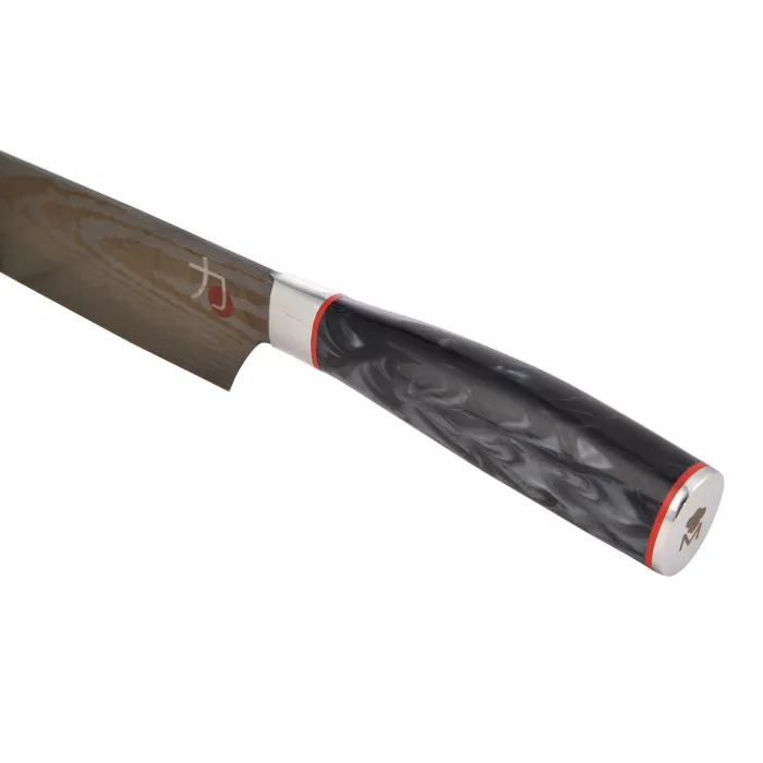 Ручки ножів зроблені зі смоли, ретельно відполіровані та безпосередньо з’єднані з частиною леза для досягнення стабільності та точності, які так важливі для найкращих кухарів Японії.