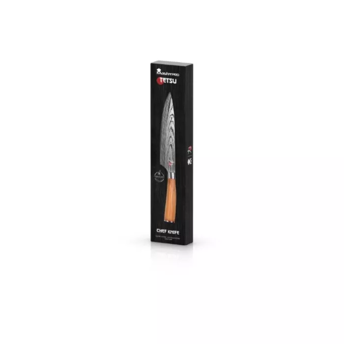 Ножі серії Tetsu відрізняються винятковою міцністю, виготовлені з високоякісної нержавіючої сталі та забезпечують максимальний контроль і впевненість під час приготування їжі. Леза мають антипригарне покриття з ефектом дамаської сталі, що забезпечує бездоганний кут різу та легке ковзання по продуктах.