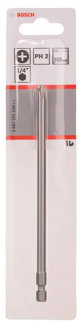 Біта Bosch Extra-Hart PH2 довжиною 152 мм із зовнішнім шестигранником ¼ дюйма на хвостовику. Виготовлені з високоякісної сталі з підвищеною твердістю, біти вирізняються посиленою міцністю та зносостійкістю. Особливий дизайн робочої частини згладжує найбільший крутний момент.