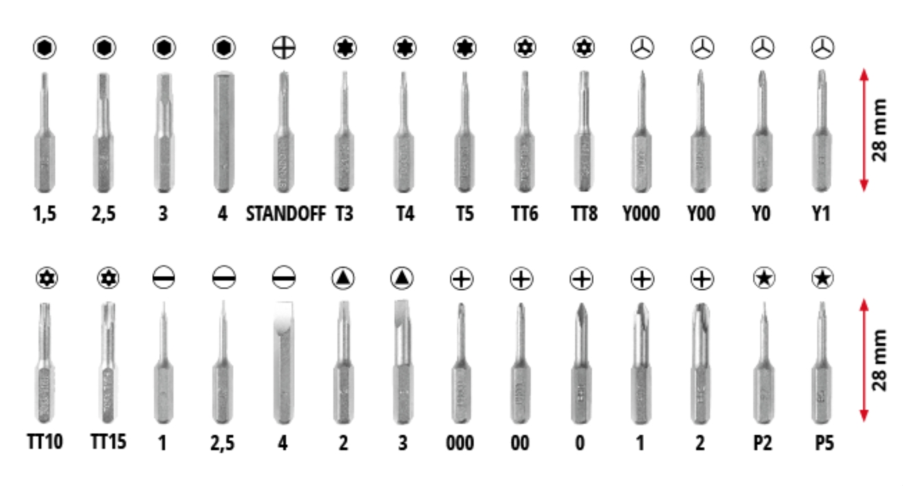 Набір прецизійних біт Einhell (33 предмети) — компактний комплект для ремонту та обслуговування смартфонів, ноутбуків та іншої електроніки. Містить 27 біт із високоякісної сталі S2 (PH, SL, Torx, Pentalobe, Hex, Tri-Wing, TA, Standoff тощо) з 4-мм хвостовиком та нікельованим покриттям, 5 хромованадієвих торцевих головок, пластиковий тримач-викрутку з обертовим ковпачком та вбудованим інструментом для SIM-карт. Усе зберігається в практичному магнітному боксі з прозорою кришкою.