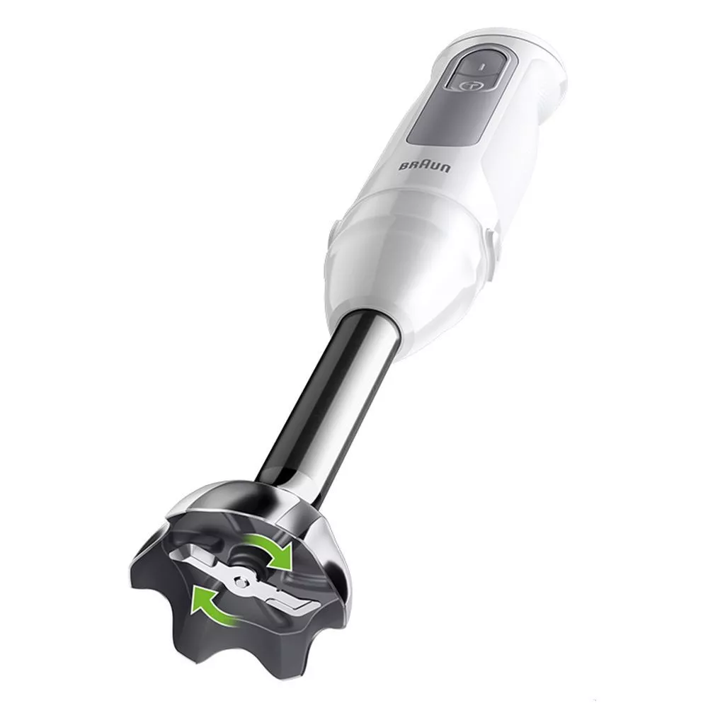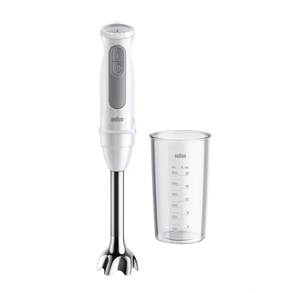 Занурювальний блендер серії MultiQuick 5. Максимальна потужність моторного блоку: 1000 Вт. Кількість швидкостей: 21+Турбо режим. Колір: білий. У комплектацію входить: моторний блок із системою EasyClick Plus (Type: HB501AI); металева блендерна ніжка з гострими ножами з нержавіючої сталі, виконана за технологією PowerBell VPlus та SplashControl; мірна склянка з чіткою мірною шкалою на 600 мл.