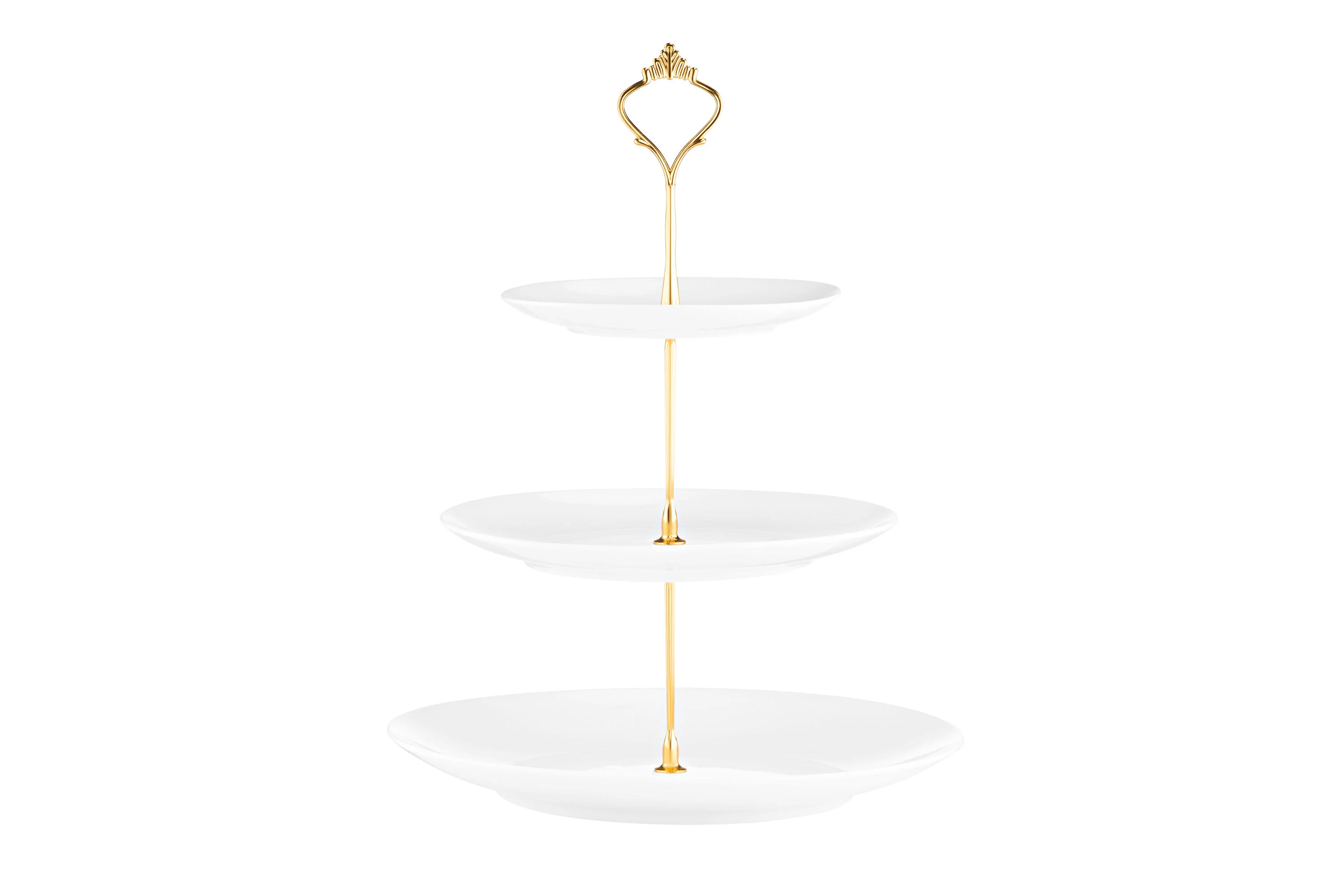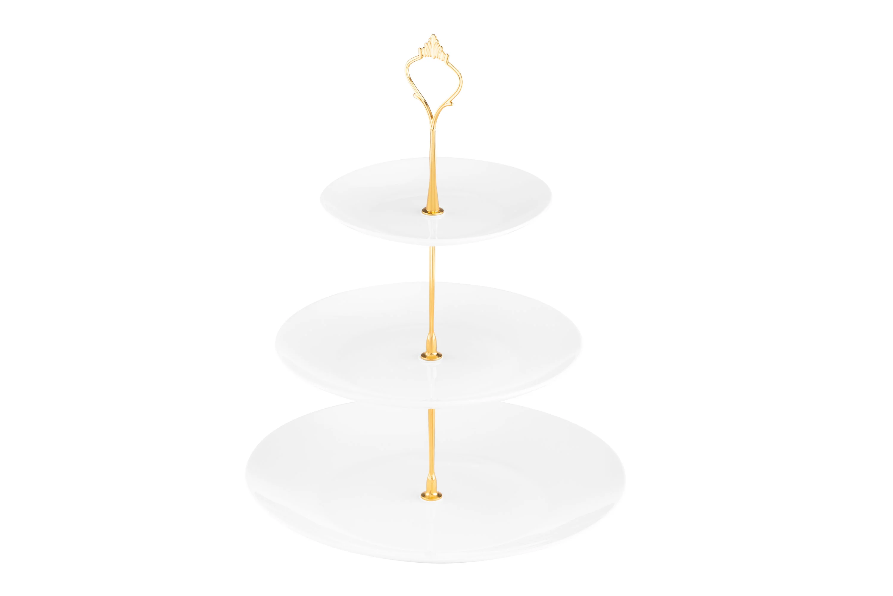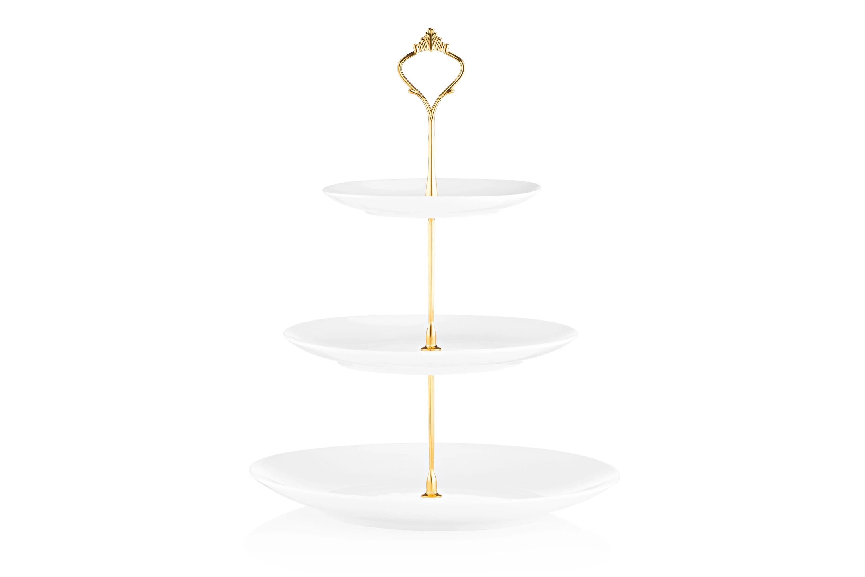 Вишукано подати цукерки, фрукти чи тістечка допоможе триярусне блюдо з порцеляни ARDESTO. Кожна з тарілок має різний діаметр: найменша – 15,5 см, середня – 20,5 см, а найбільша – 26 см, вони встановлюються на металеву ніжку золотистого кольорі. Блюдо легке в догляді, якщо його розібрати, то тарілки можна мити в посудомийній машині. Загальний розмір виробу: 26,5 × 32 см.