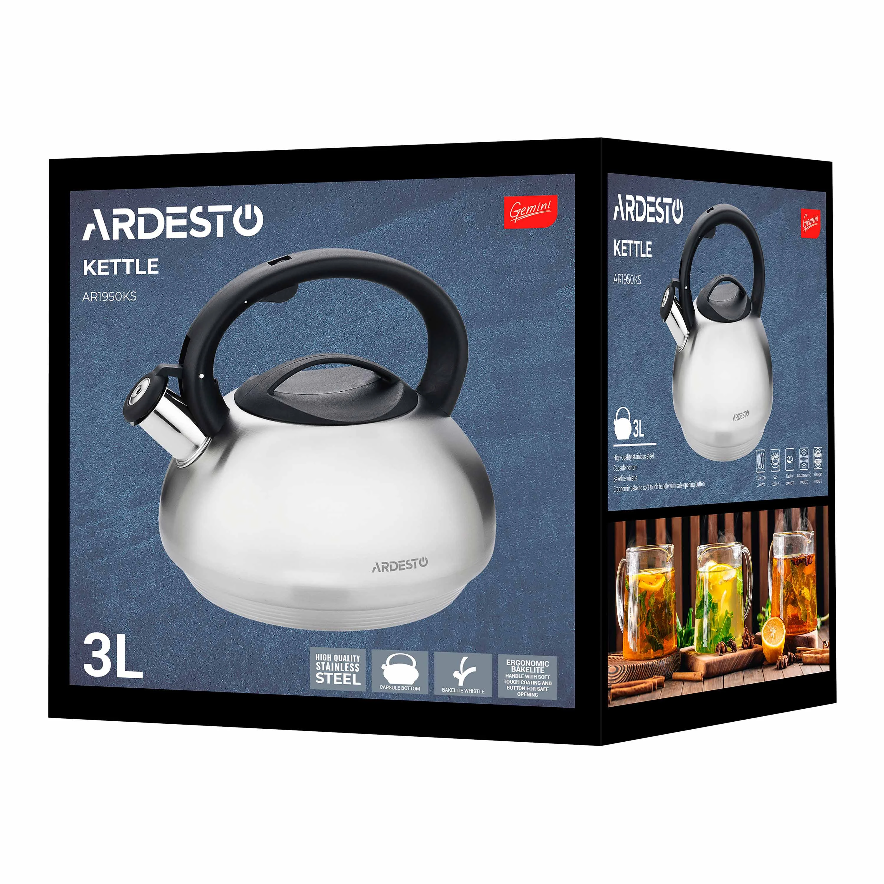 Поціновувачам незвичних форм чайник ARDESTO Gemini AR1950KS точно буде до вподоби. Еліпсоїдна форма, плавні вигини в поєднанні з елегантним сірим кольором виконання – дизайн поза часу. На руків’ї, що покрито чорним нейлоном, вбудовано регулятор для відкриття й закриття кришечки на носику. Ця особливість конструкції мінімізує ризик обпектися гарячою парою. Крім того, модель вирізняється великим об’ємом (3 л) і рівномірно потовщеним корпусом і днищем – 0,6 мм.