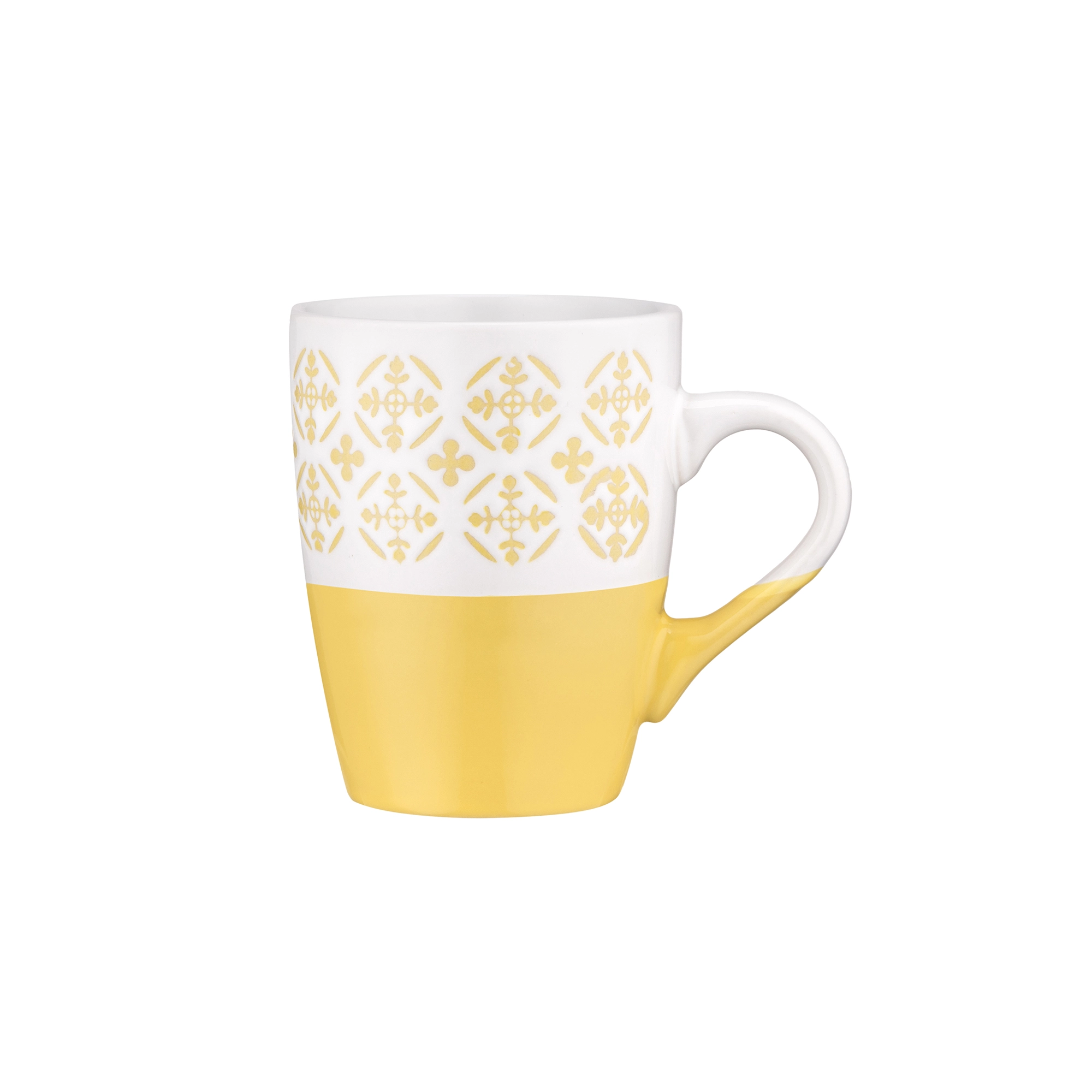 Яскраву та стильну чашку серії Ornament виготовлено з якісної кераміки. Її об’єм становить 320 мл, основні кольори – жовтий і білий, дизайн гармонійно доповнено геометричним візерунком. За висоти 10,5 см верхній діаметр складає 8,3 см. Згодиться для щоденного використання, адже придатна до миття в посудомийній машині та використання в мікрохвильовій печі.