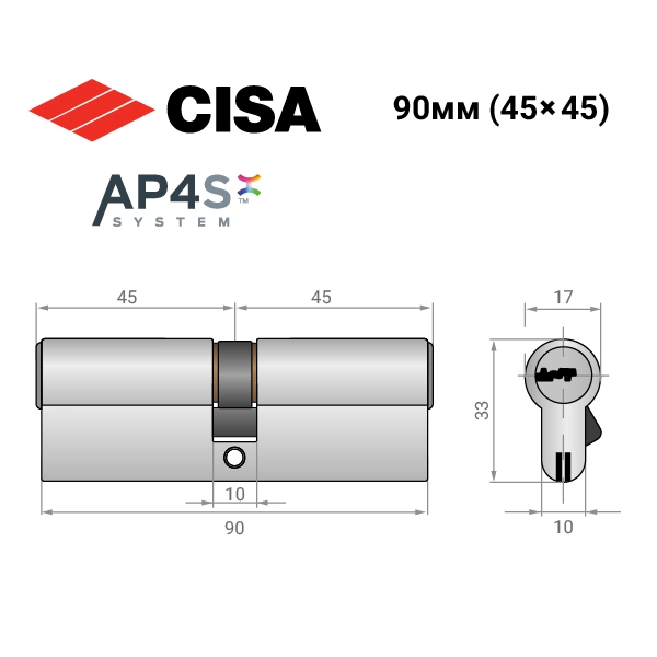 Циліндр CISA AP4 S 90 (45*45) нікель матовий 5 ключів