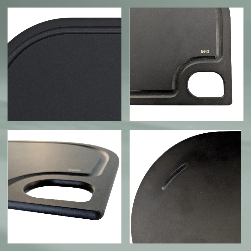 Дошки KELA Nobel мають зручний отвір для підвішування та жолобок по периметру для відведення з поверхні зайвої рідини. Завдяки нижній нековзкій стороні, дошка надійно утримується на місці, що забезпечує безпечну роботу на кухні.