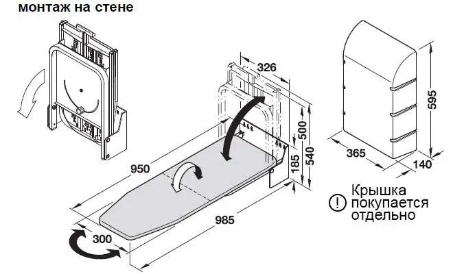У розкладеному стані може повертатися на 180 градусів і розміщуватися вздовж стіни. Прасувальна дошка кріпиться до стіни і в закритому стані закривається боксом - чохлом.