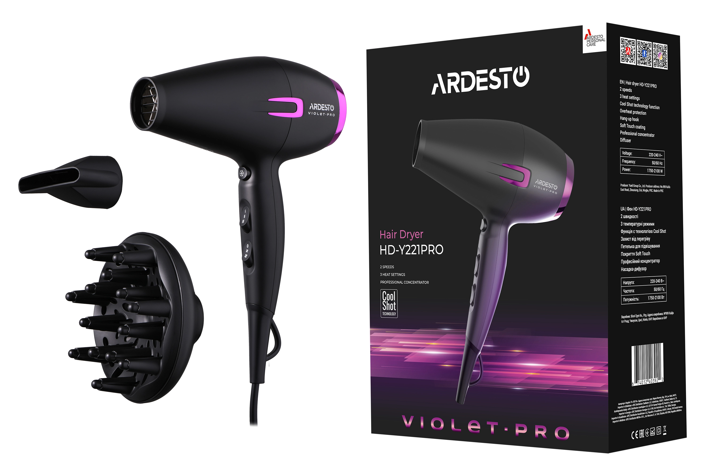 Фен Ardesto Violet PRO HD-Y221PRO ,1750-2100Вт, 2 швидкості, 3режими,дифузор, чорний