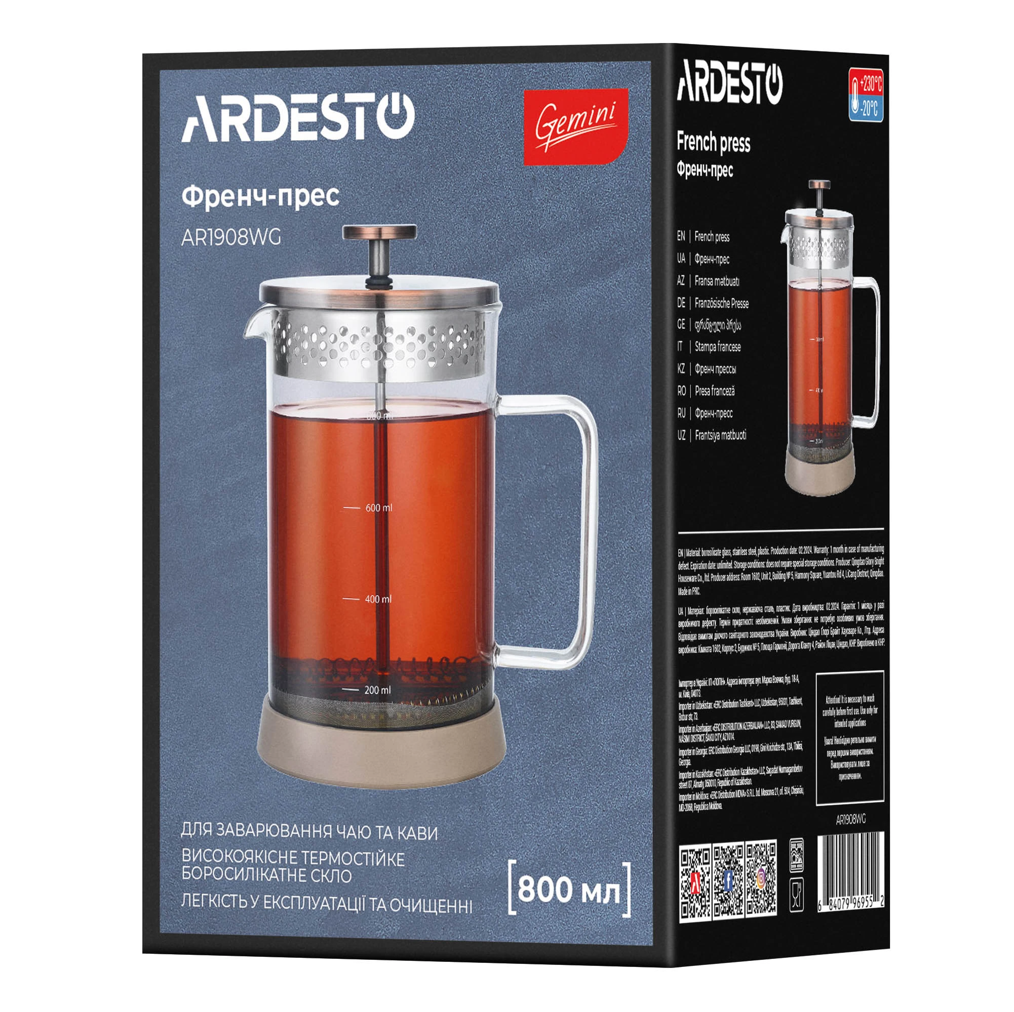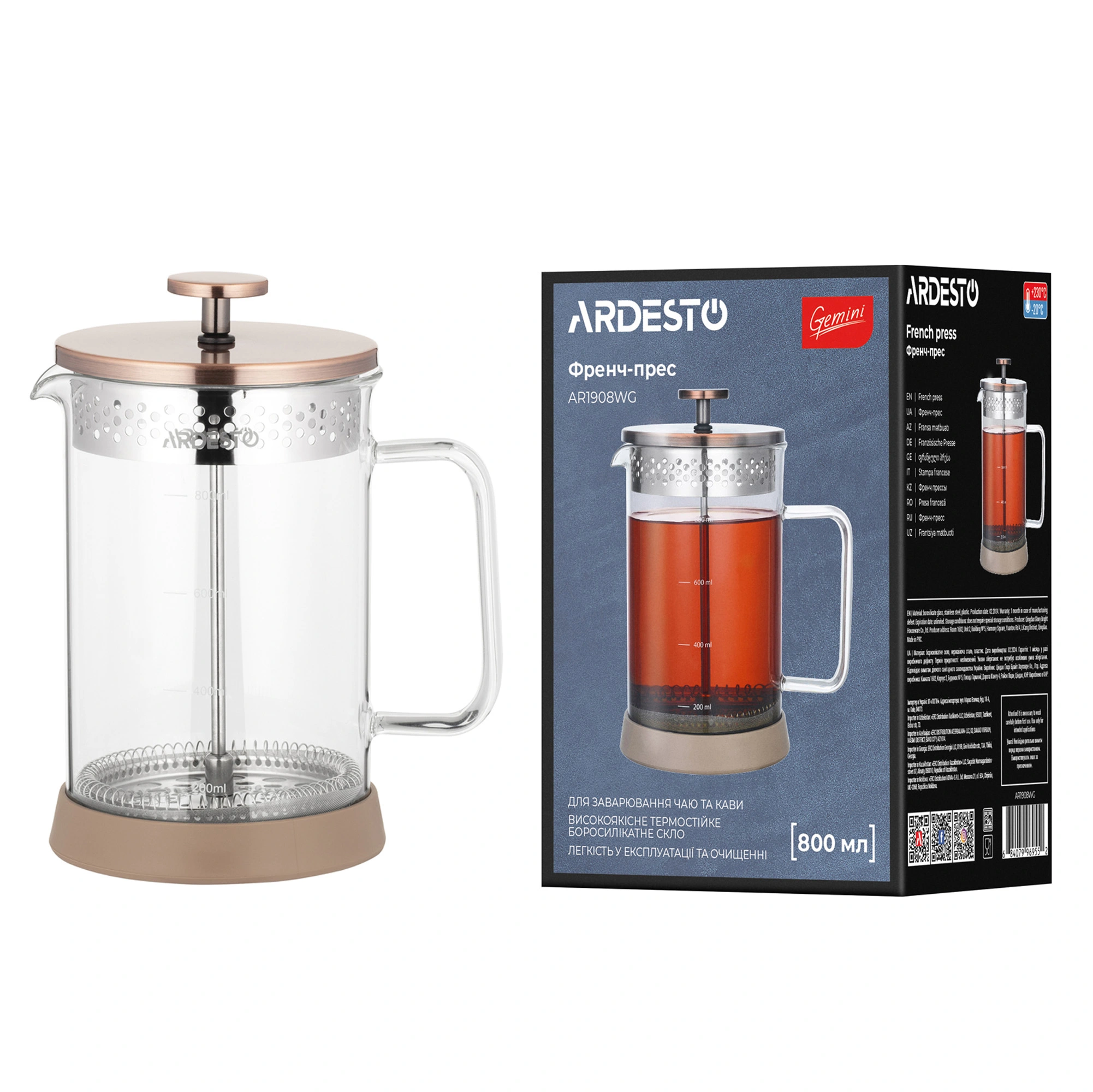 Френч-прес Ardesto Gemini, 800мл, боросилікатне скло, нержавіюча сталь, прозорий, мідний