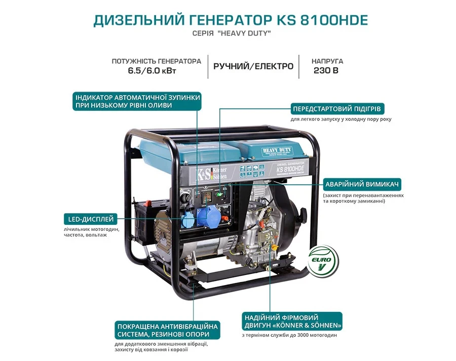 Генератор дизельний Konner&Sohnen KS 8100HDE (EURO V), 230В, 6.5кВт, електростартер, 117кг