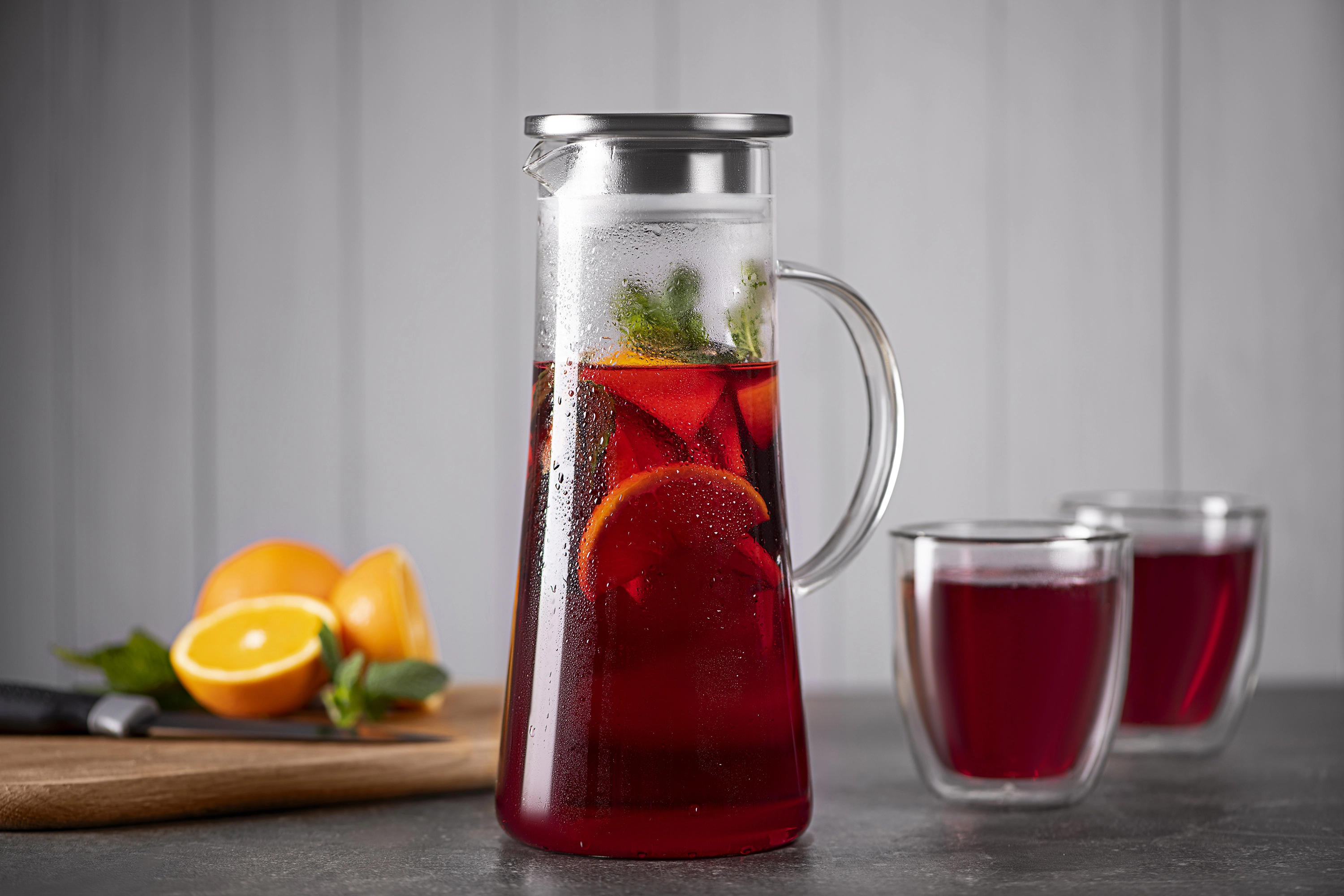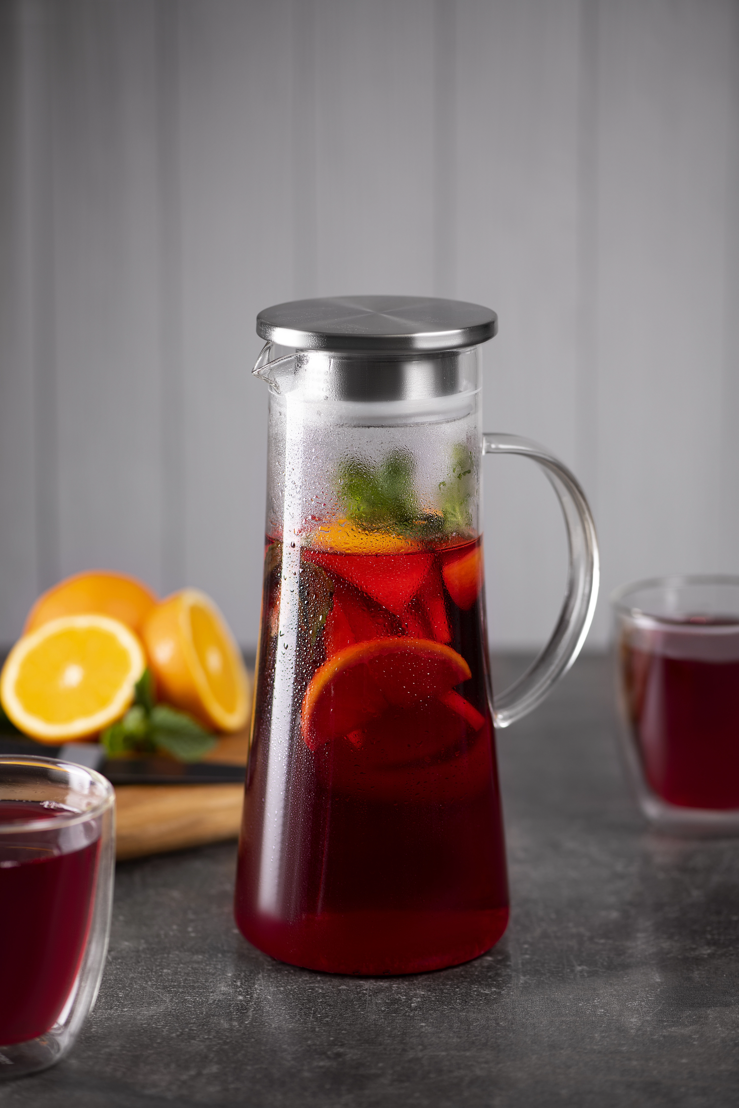 Глечик з кришкою об’ємом 1400 мл для гарячих та холодних напоїв. Виготовлений з термостійкого боросилікатного скла, а кришка з нержавіючої сталі, доповнена силіконовим ущільнювачем.
