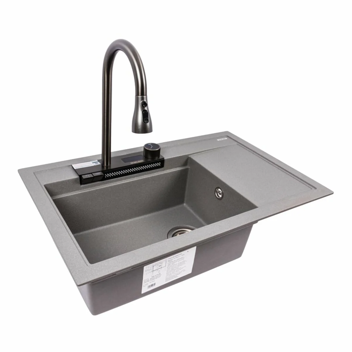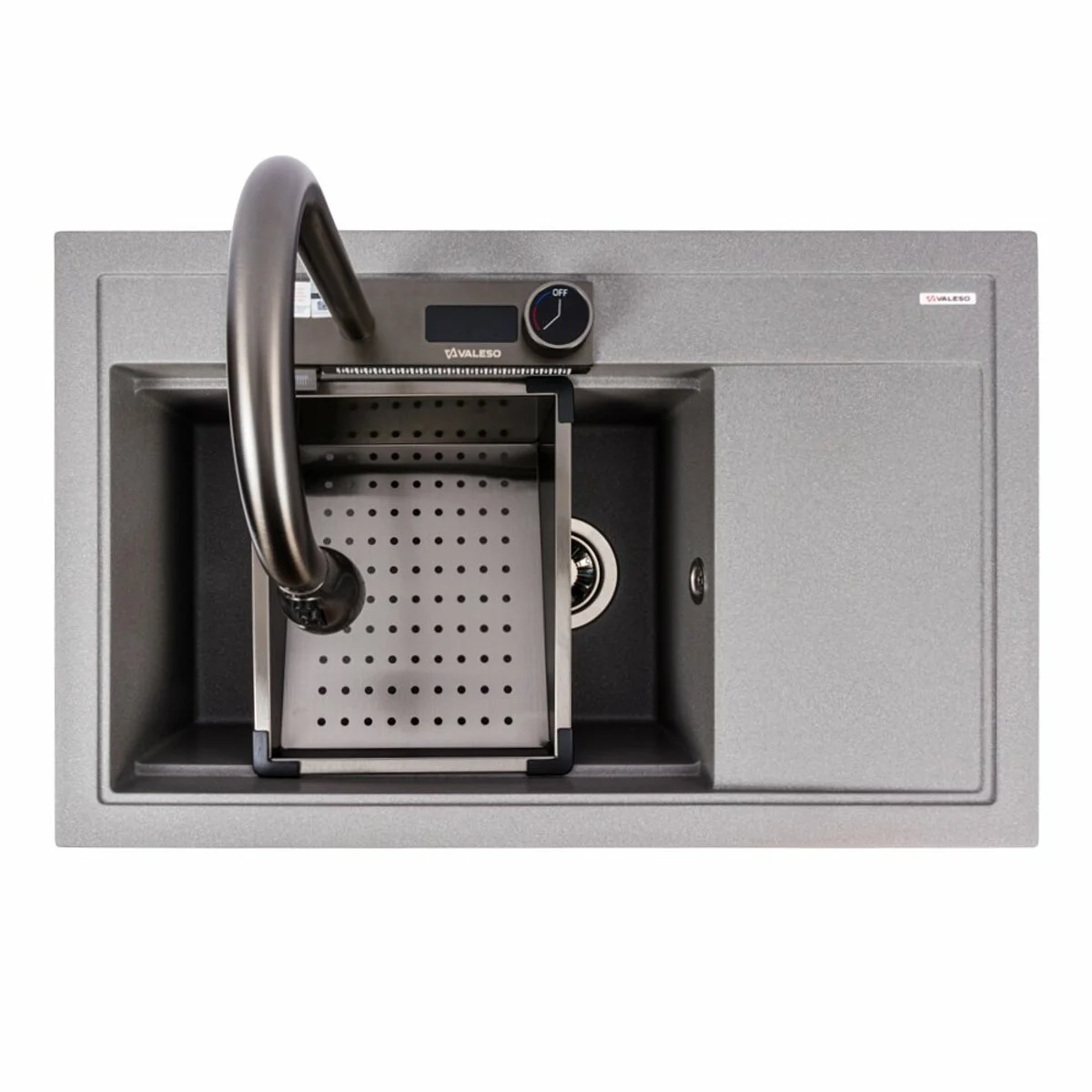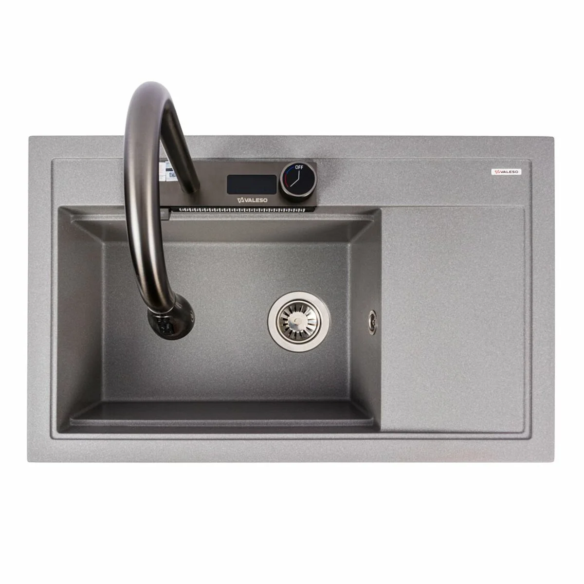 Гранітна мийка VALESO 7950 ATRUM у кольорі сірий мусон — це сучасне поєднання стилю, функціональності та надійності. Виготовлена з високоякісного гранітного композиту, вона відзначається стійкістю до механічних пошкоджень, перепадів температур і впливу побутової хімії. Матова поверхня не лише додає вишуканості, а й легко очищується.