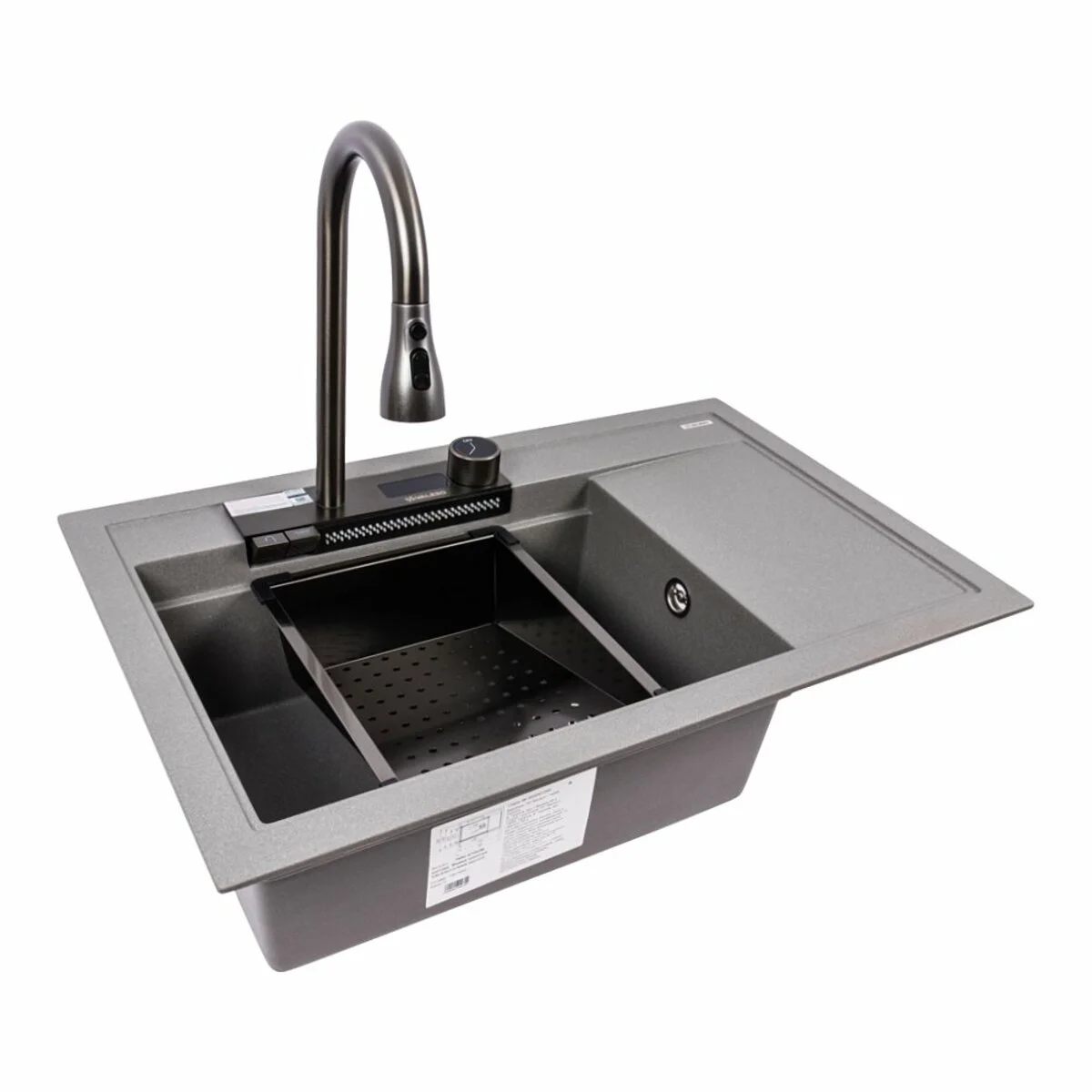 Мийка врізного типу, тобто монтується у виріз стільниці — це забезпечує охайний вигляд та легкий догляд за робочою поверхнею. У комплекті передбачено змішувач у стильному дизайні, а також окремий режим "водоспад", який дуже зручно використовувати для миття фруктів, овочів або наповнення ємностей приємним м’яким потоком води.