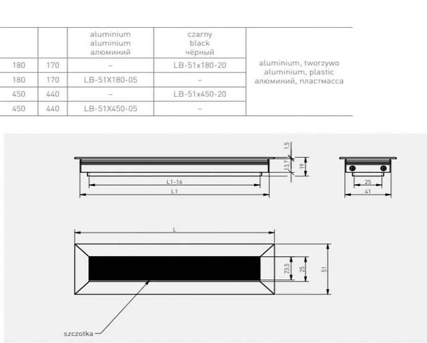Продукт має сучасний вигляд з прямокутним поперечним перерізом і доступний у двох колірних варіантах: алюмінієвий та чорний, що дозволяє легко інтегрувати його в будь-який інтер'єр.