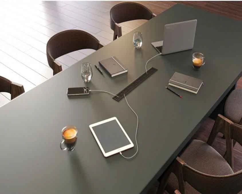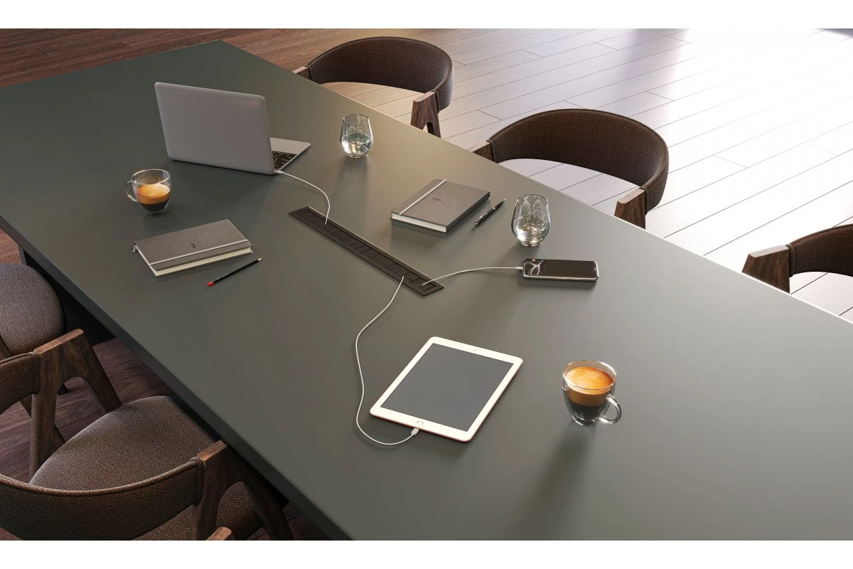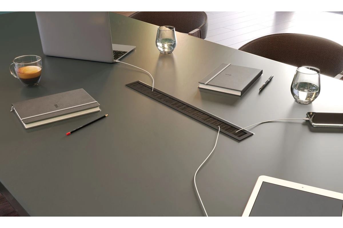 Кабельний пропуск обладнаний втулкою, яка захищає кабелі від пошкоджень, що можуть бути спричинені гострими краями отворів у стільниці. Це допомагає уникнути проблем з ізоляцією проводів і продовжити їх термін служби.