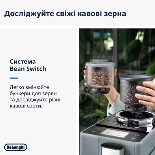 Потужність 1450 Вт. Тиск помпи: 19 бар. Система «LatteCrema». Кольоровий 3,5'' TFT дисплей. Обсяг контейнера для кави: 2x250 г. Знімний резервуар для води на 1,4 л. Програма видалення накипу, очищення і ополіскування. Автовідключення. Глечик для молока (автокапучинатор). 2 швидкознімні контейнери для кавових зерен із системою Bean Switch та технологією Bean Adapt.]]>