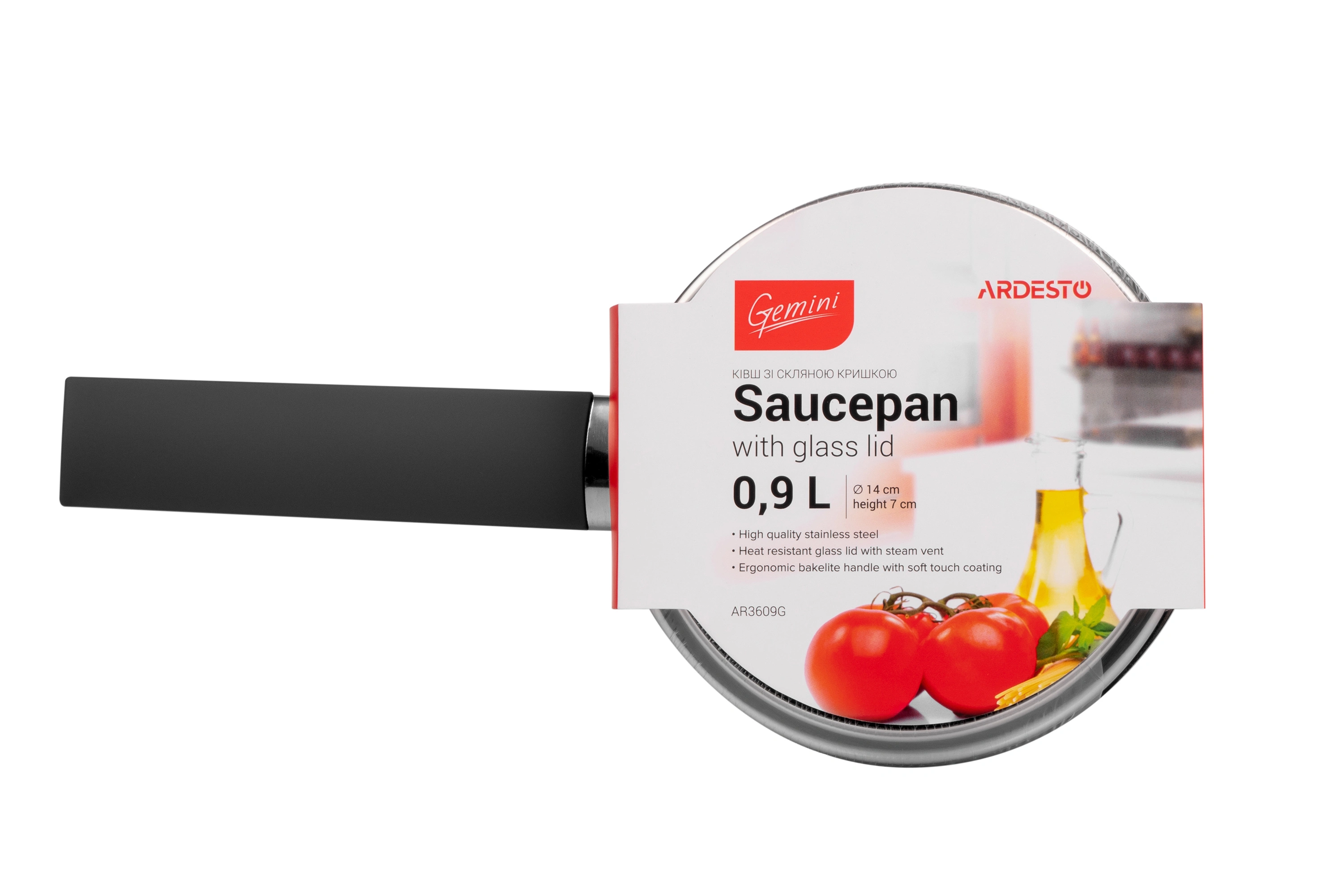 Ківш зі скляною кришкою Ardesto Gemini Trento, 0.9л, нержавіюча сталь, бакеліт