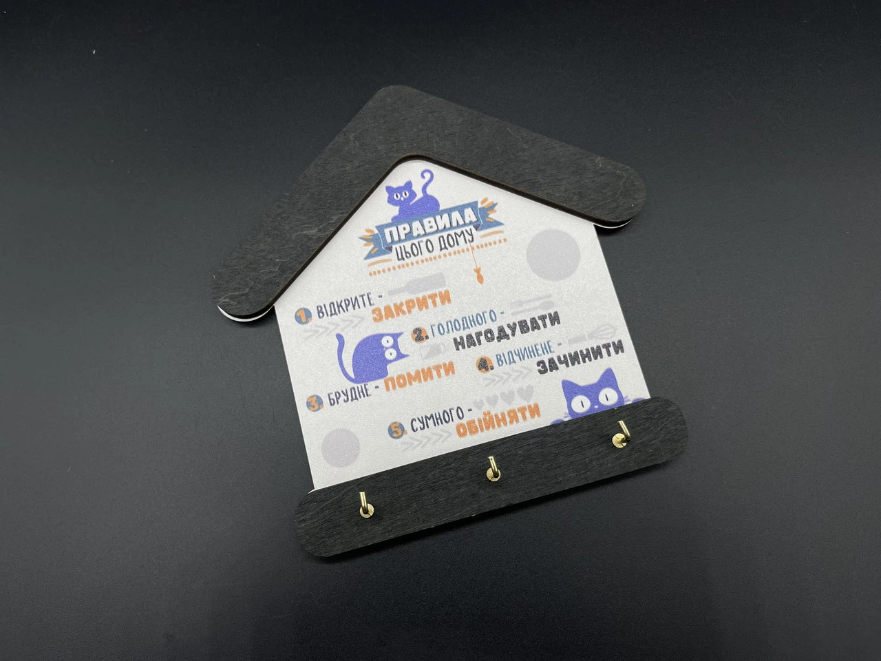 Ключниця настінна дерев'яна, 18х18см, "Правила Дому", у формі будинку 3 гачки
