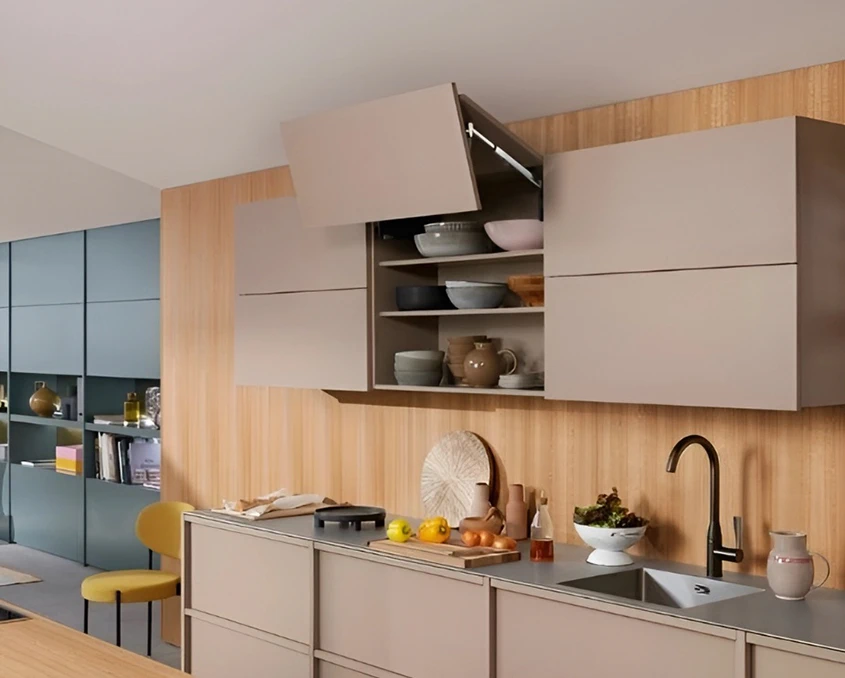 Aventos HF підходить для фасадів різного стилю — з деревини, скла або їх комбінацій. Механізм не порушує зовнішнього вигляду меблів, адже система кріпиться приховано, зберігаючи естетику інтер’єру. Також передбачено інтеграцію з електричною системою Servo-Drive, яка забезпечує автоматичне відкривання дверцят легким натисканням — ідеальне рішення для сучасних кухонь, де функціональність поєднується з комфортом.