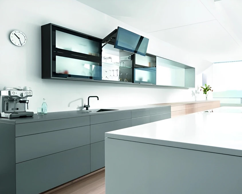Aventos HF підходить для фасадів різного стилю — з деревини, скла або їх комбінацій. Механізм не порушує зовнішнього вигляду меблів, адже система кріпиться приховано, зберігаючи естетику інтер’єру. Також передбачено інтеграцію з електричною системою Servo-Drive, яка забезпечує автоматичне відкривання дверцят легким натисканням — ідеальне рішення для сучасних кухонь, де функціональність поєднується з комфортом.