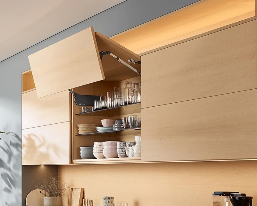 Aventos HF підходить для фасадів різного стилю — з деревини, скла або їх комбінацій. Механізм не порушує зовнішнього вигляду меблів, адже система кріпиться приховано, зберігаючи естетику інтер’єру. Також передбачено інтеграцію з електричною системою Servo-Drive, яка забезпечує автоматичне відкривання дверцят легким натисканням — ідеальне рішення для сучасних кухонь, де функціональність поєднується з комфортом.