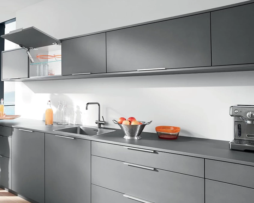 Aventos HK-XS від Blum — компактний підйомний механізм, ідеальний для маленьких верхніх шаф і вузьких пеналів. Завдяки своєму універсальному дизайну, він підходить для фасадів різних розмірів і дозволяє легко відкривати дверцята вгору, забезпечуючи зручний доступ до вмісту шафи навіть у обмеженому просторі.