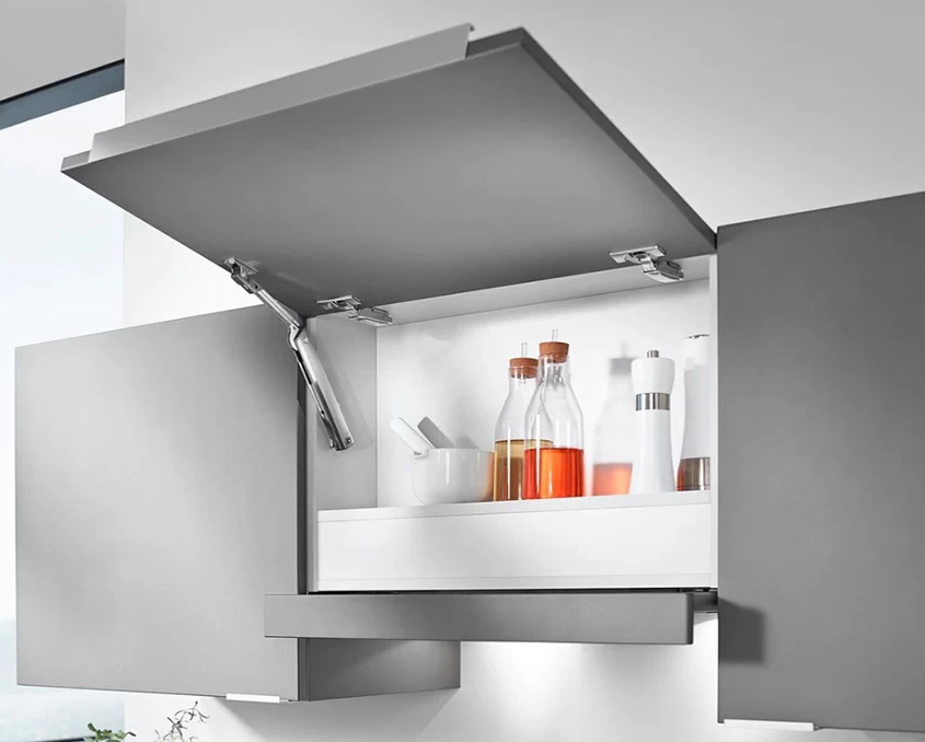 Aventos HK-XS від Blum — компактний підйомний механізм, ідеальний для маленьких верхніх шаф і вузьких пеналів. Завдяки своєму універсальному дизайну, він підходить для фасадів різних розмірів і дозволяє легко відкривати дверцята вгору, забезпечуючи зручний доступ до вмісту шафи навіть у обмеженому просторі.