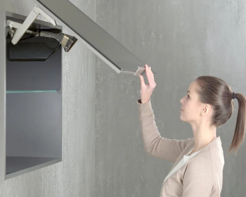 Aventos HS від Blum — підйомний механізм, ідеальний для великих та важких фасадів, які піднімаються і плавно нахиляються над корпусом шафи. Підходить для широких верхніх шаф, надаючи зручний доступ до їхнього вмісту без необхідності відкривати дверцята убік.