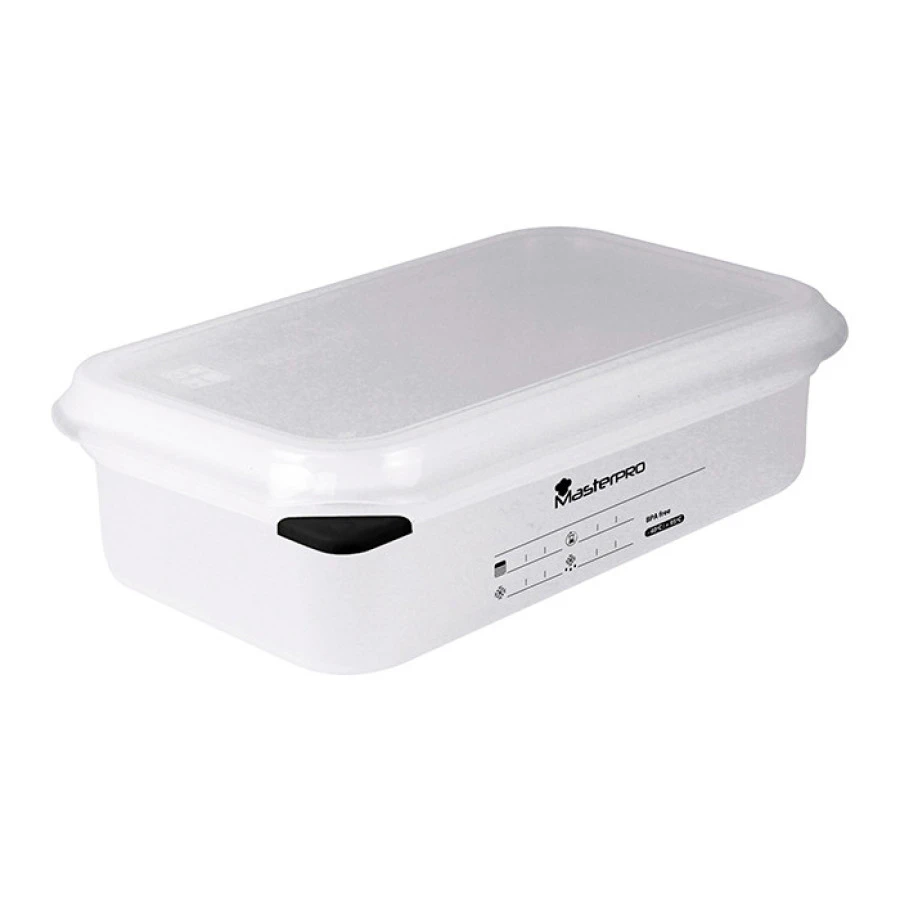 Masterpro допоможе вам зберегти всі ваші продукти і готові страви завдяки дуже міцному герметичному контейнеру з поліпропілену об'ємом 1,8 л. Герметична кришка не пропускає повітря і зберігає все всередині в найкращих умовах. Прозорий білий дизайн має секції для позначення дати зберігання і, таким чином, для більш точного контролю часу консервації. Можна використовувати в мікрохвильовій печі, холодильнику і морозильній камері. Не містить бісфенолу, легко миється, можна мити в посудомийній машині.