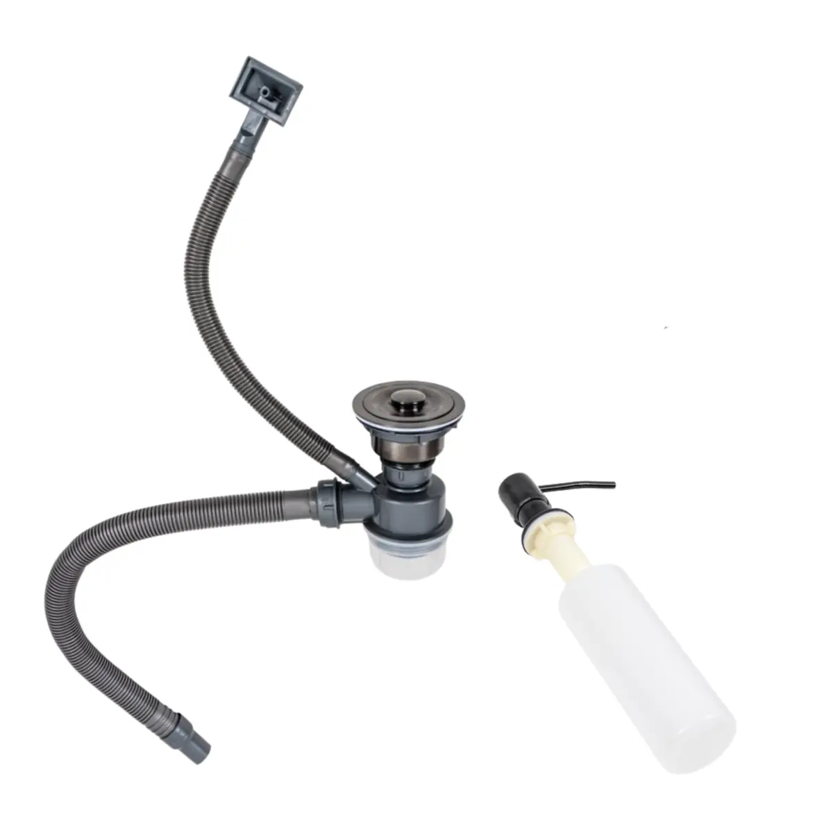 Комплектація мийки: дозатор в кольорі нержавійка, сифон, кріплення.