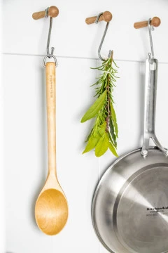 Ручка ложки оснащена гачком із нержавіючої сталі для зручного підвішування та зберігання на кухні, що дозволяє підтримувати порядок.
