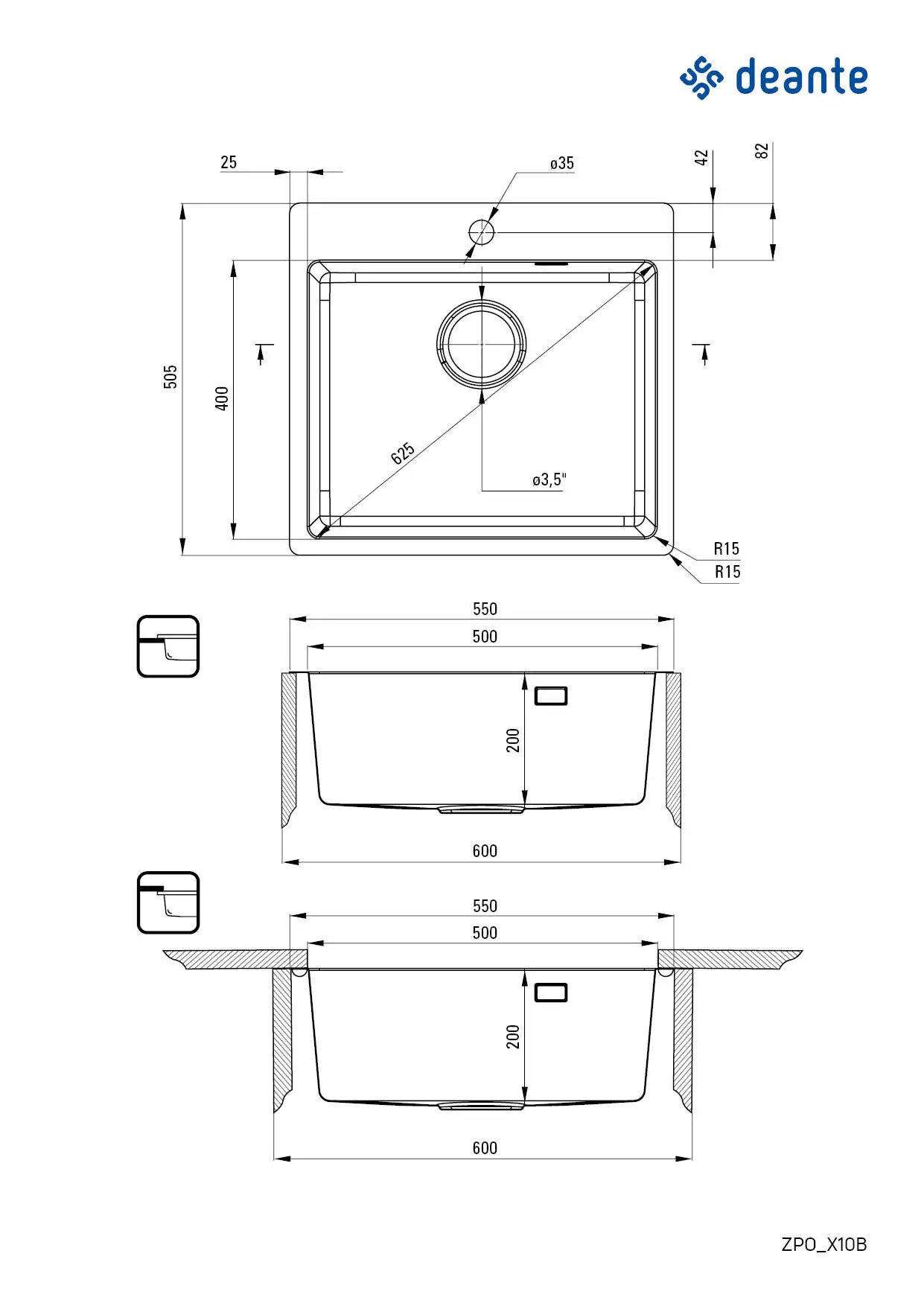 Мийка кухонна Deante Olfato, нержавійка, квадрат, без крила, 550х505х200мм, чаша - 1, універсальна,