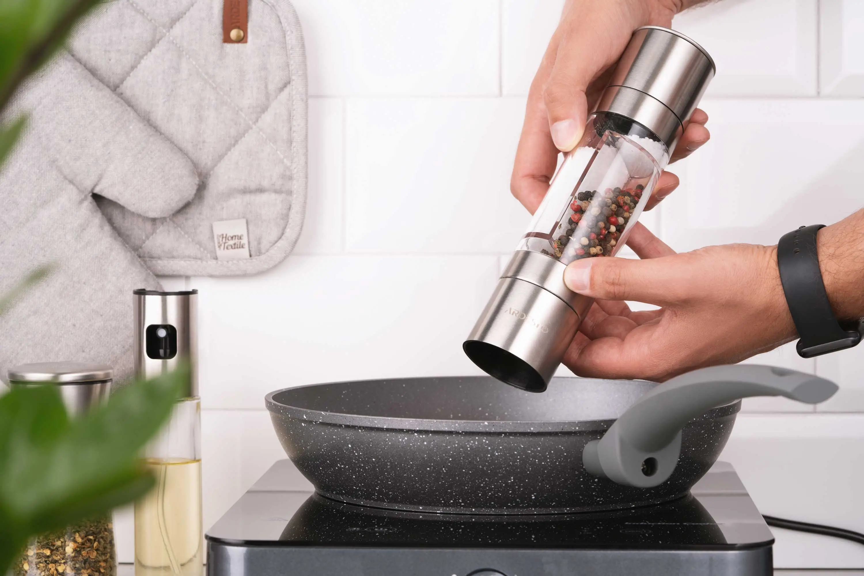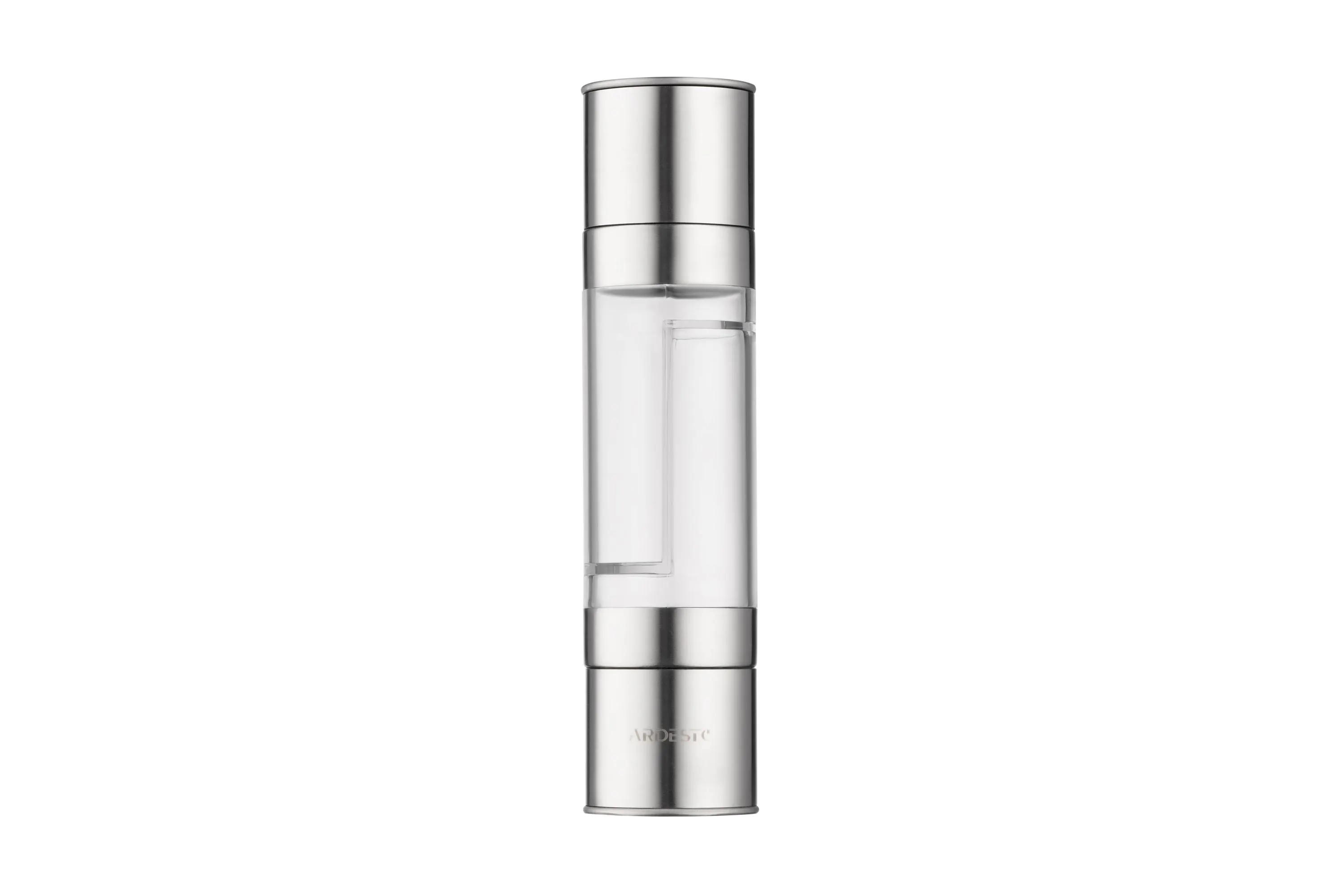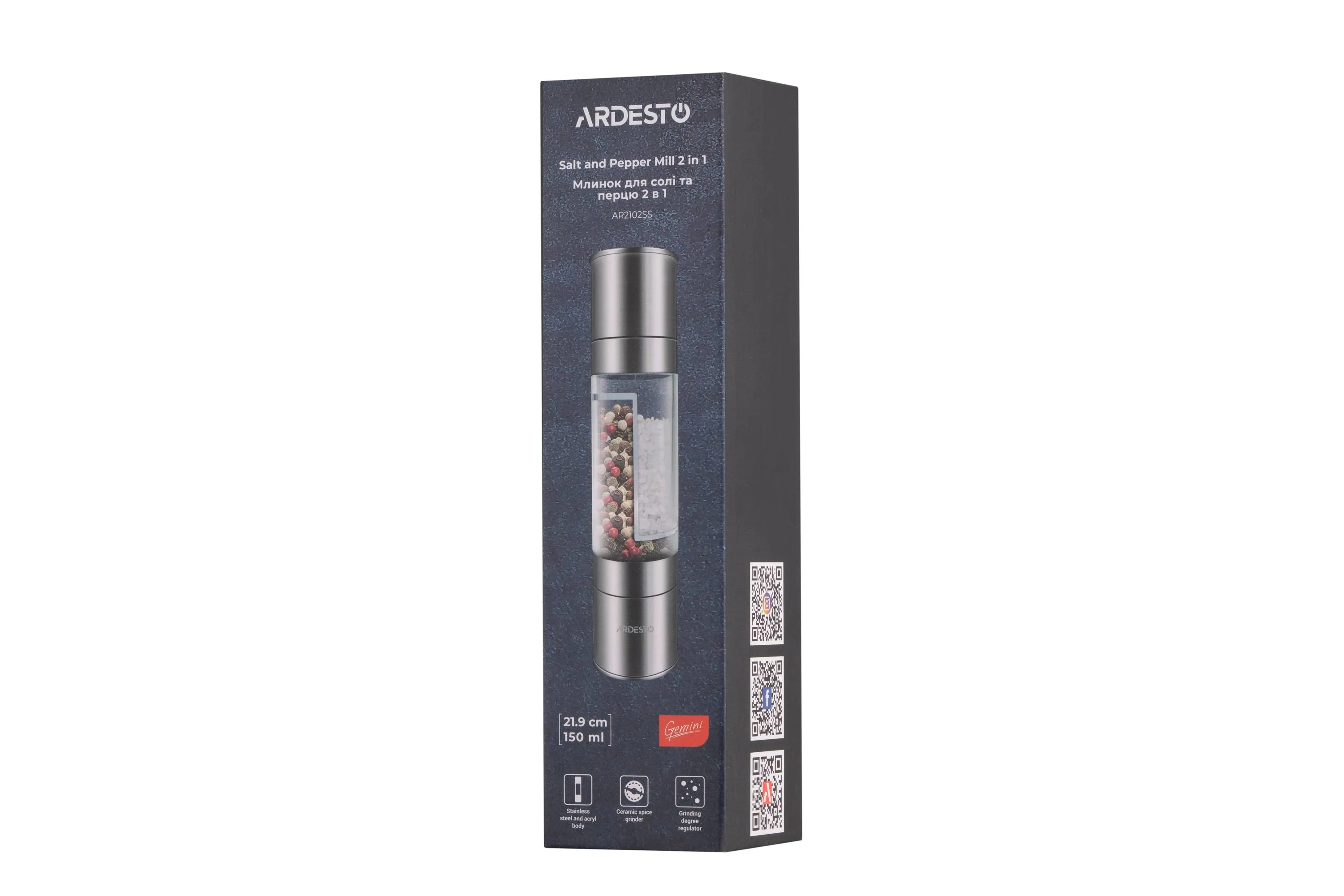 Млинок для солі та перцю 2 в 1 ARDESTO Gemini об’ємом 150 мл виготовлено з нержавіючої сталі та акрилу. Робота млинка здійснюється шляхом обертання однієї з рухомих частин, під час якого керамічне лезо перемелює вміст. Оснащений функцією регулювання ступеню помелу. Мити в посудомийній машині не можна.