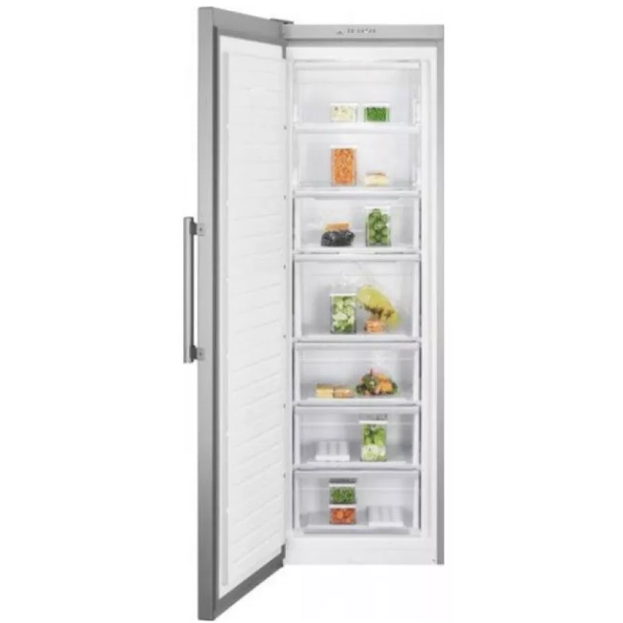 Містка вертикальна морозильна камера з No Frost-охолодженням для домогосподарств та великих магазинів. Енергозбереження відповідає класу А + +, для зберігання продуктів передбачено сім відсіків, а корисний об'єм становить 280 л. Особливості: технологія NoFrost запобігає намерзанню льоду в морозильній камері. Система Frost Free для автоматичного розморожування. Електронне керування зі світлодіодними індикаторами. Скриньки морозильної камери: 5 шт (широких). Прозорі пластикові клапани морозильної камери: 2 шт. Функція швидкого заморожування. Освітлення морозильного відділення: верхня панель, світлодіодна лампа. Розташування кріплень для дверцят: ліворуч, що навішується. Ніжки: регульовані ніжки. Колір: сірий + дверцята з нержавіючої сталі з покриттям antifinger print.