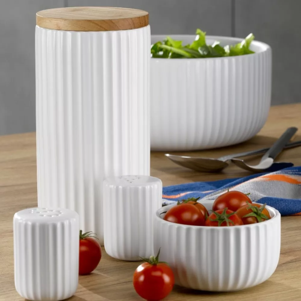 Серія посуду KELA Maila, окрім набору для солі і перцю, складається з салатників, ємностей для сипучих продуктів, форм для запікання і формочок для крем-брюле різних розмірів і об'єму, але виконаних в одному дизайні. Всі вони можуть бути куплені на нашому сайті додатково і зіставлені в єдиний сервірувальна набір.
