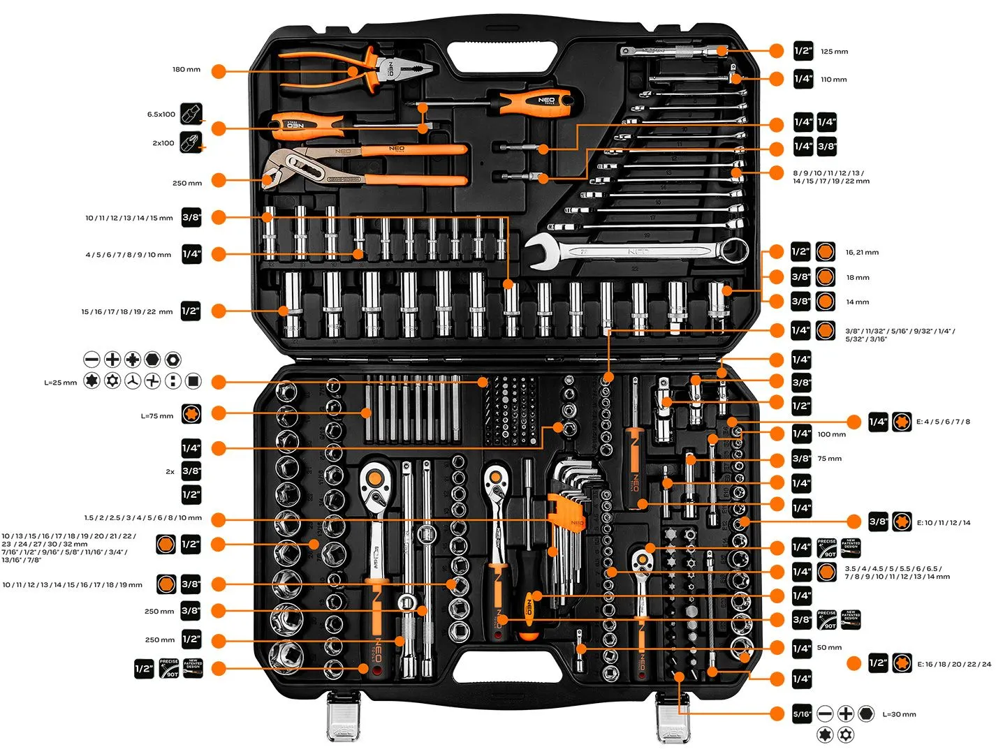 Торцеві ключі NEO (арт. 10-078) - це один з найбільших наборів, наявних в асортименті. Набір містить аж 233 елемента розмірами 1/2", 3/8" і 1/4", які виготовлені з високоякісної хромванадієвої сталі. Ключі постачаються в практичній і добротній валізі з пластику з металевими замками та зручною ручкою.