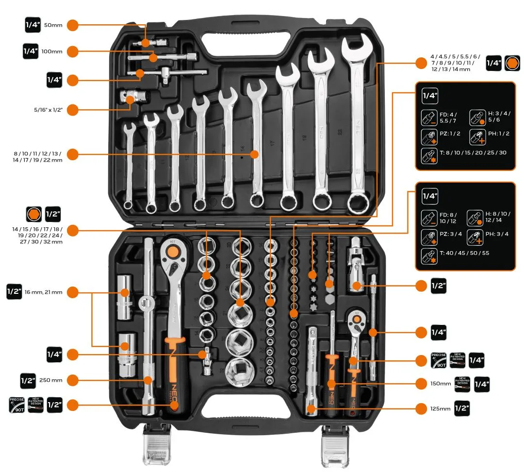 Набір інструментів Neo Tools, 82шт, 1/2", 1/4", CrV, кейс