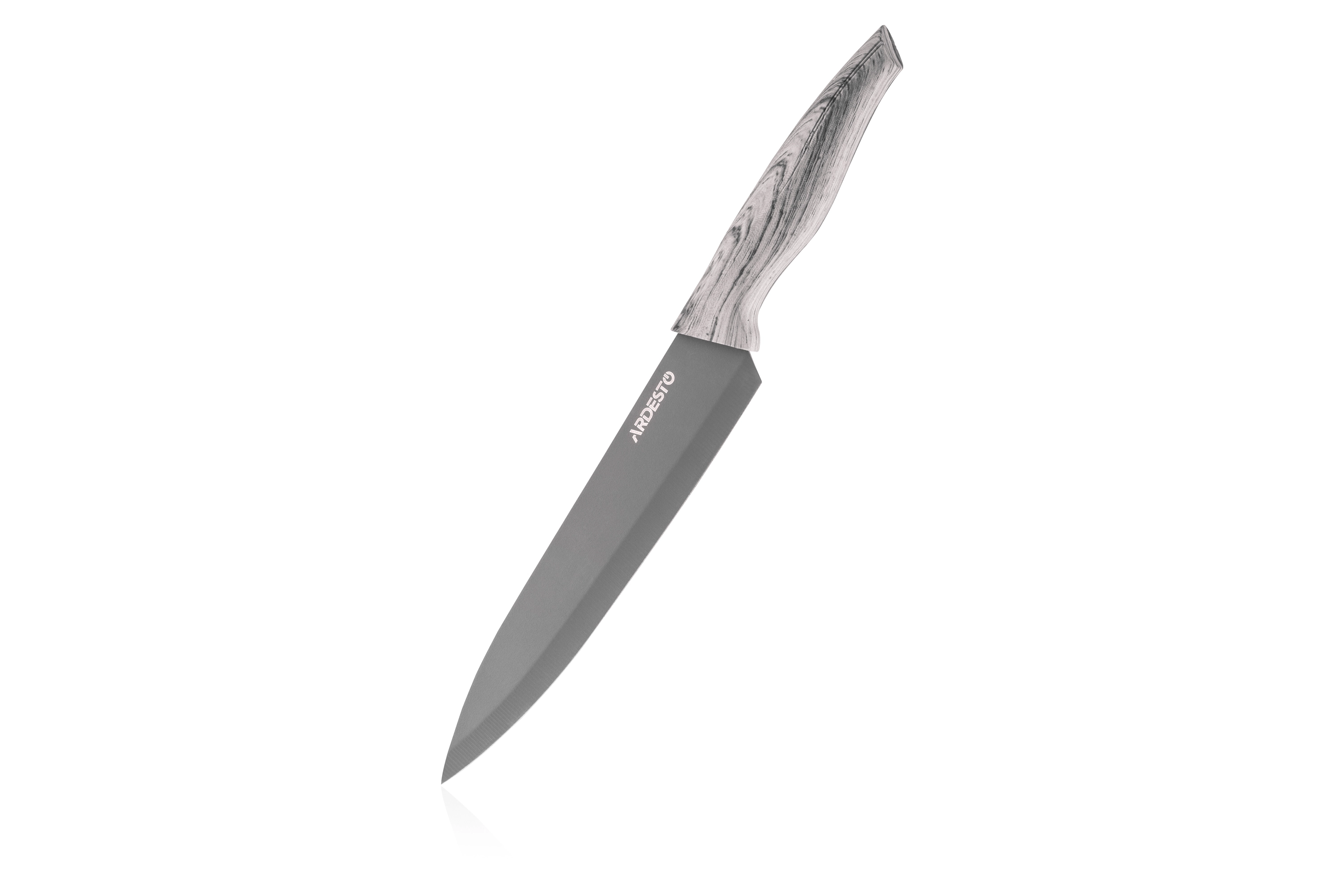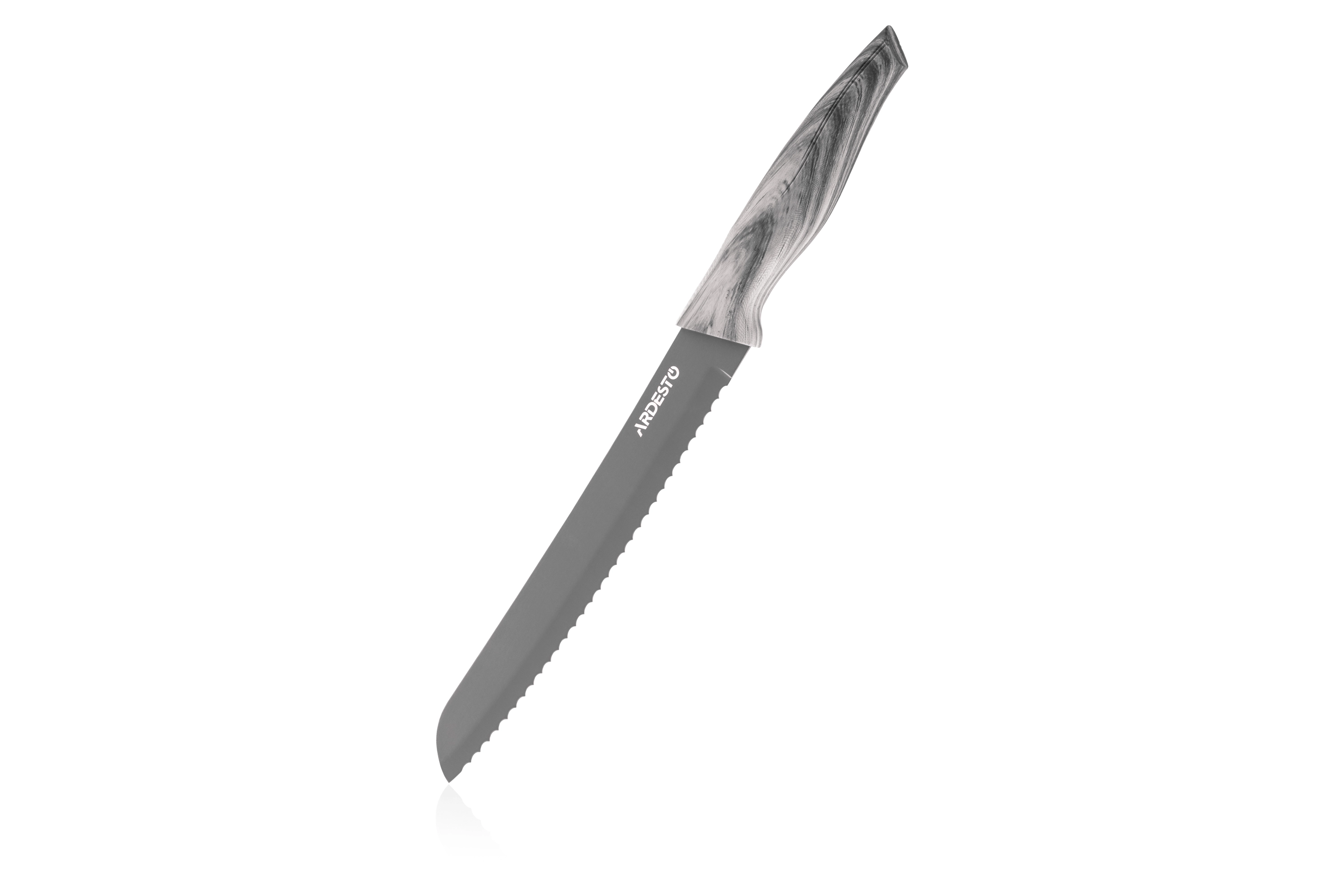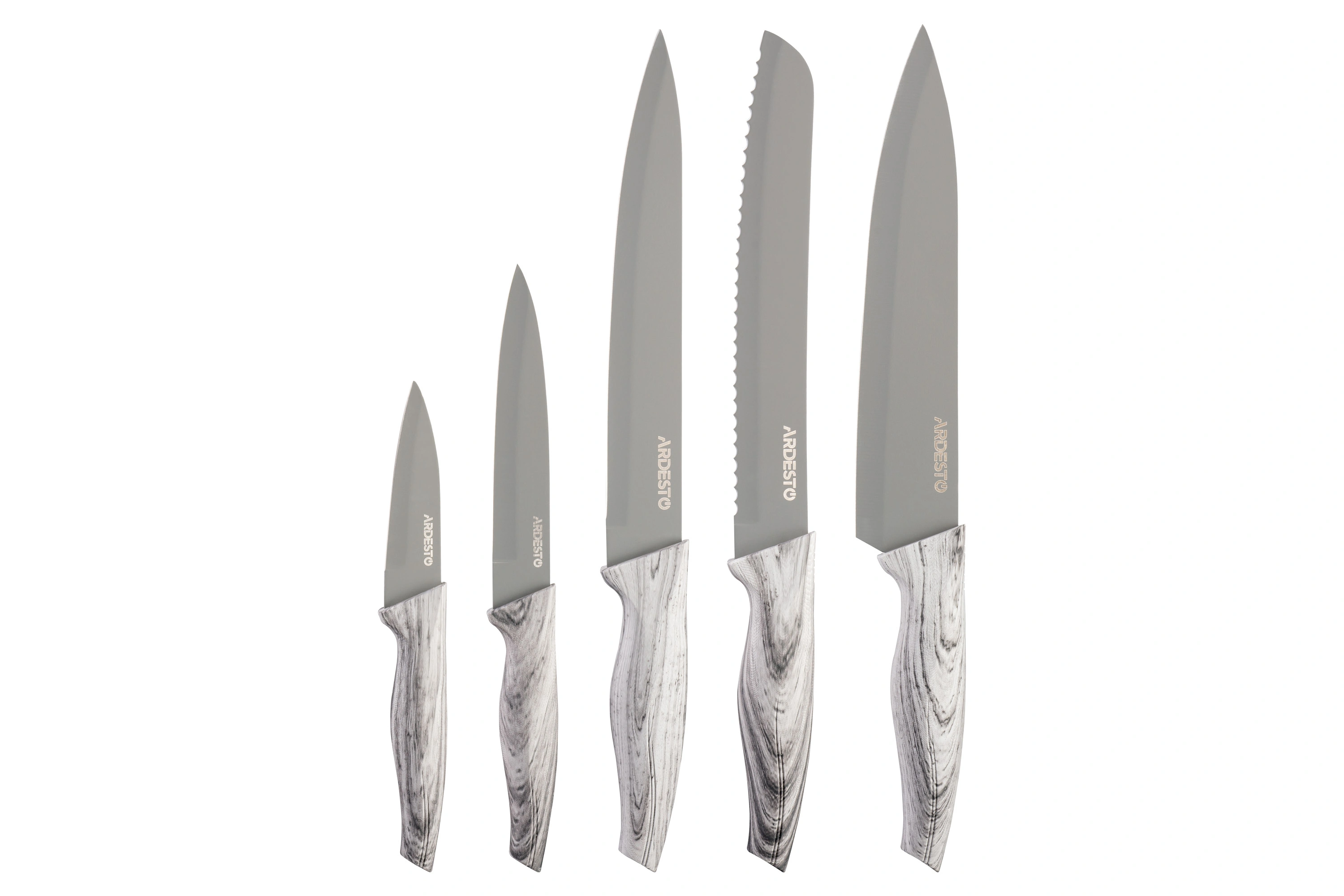 Ножі з набору ARDESTO Black Mars служитимуть довго та впораються з будь-яким завданням на кухні на найвищому рівні. Склад набору забезпечить абсолютний комфорт під час готування й містить: кухарський ніж (20,3 см), універсальний ніж (12,7 см), ніж для хліба (20,3 см), ніж слайсерний (20,3 см) і ніж для чищення овочів (8,9 см).