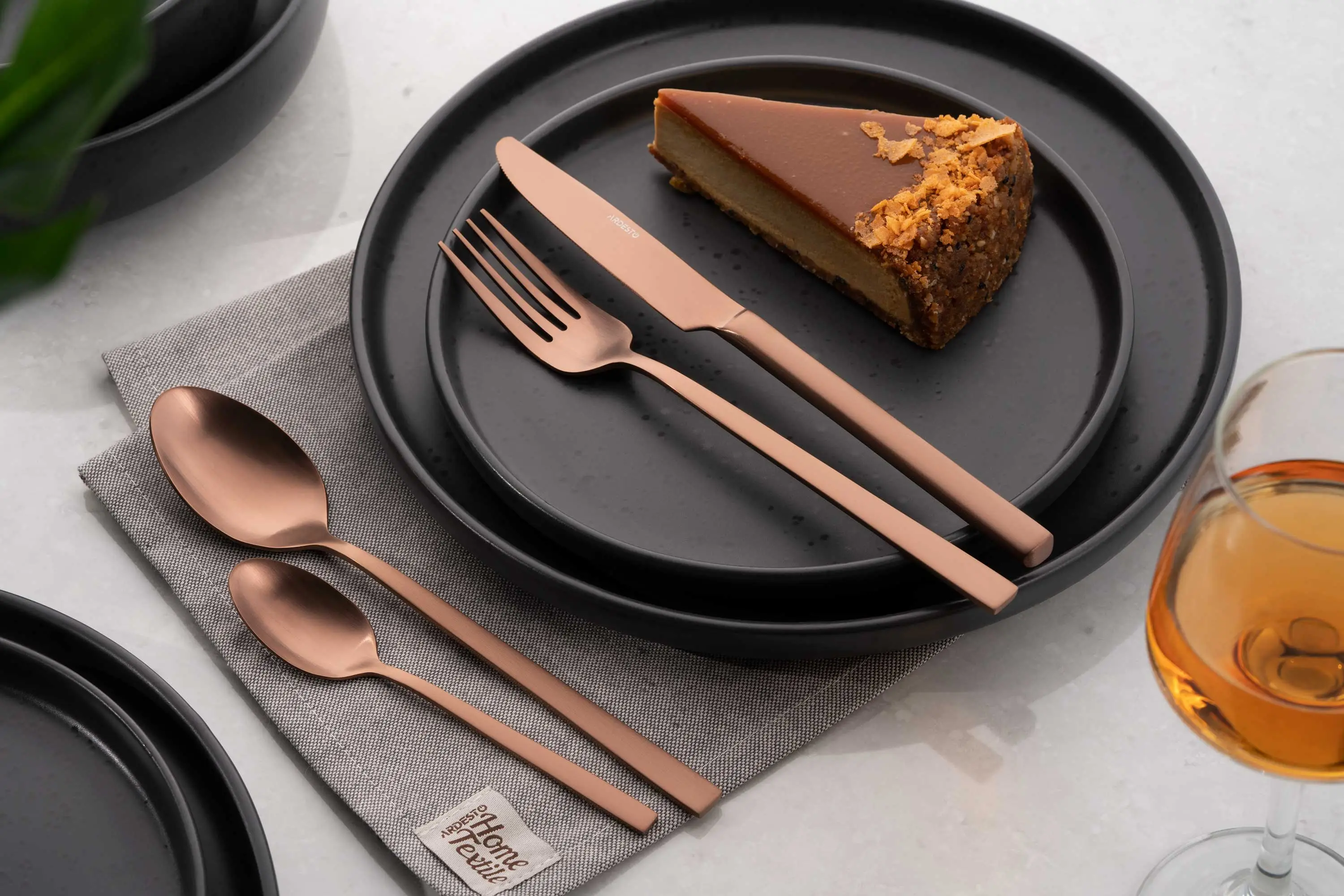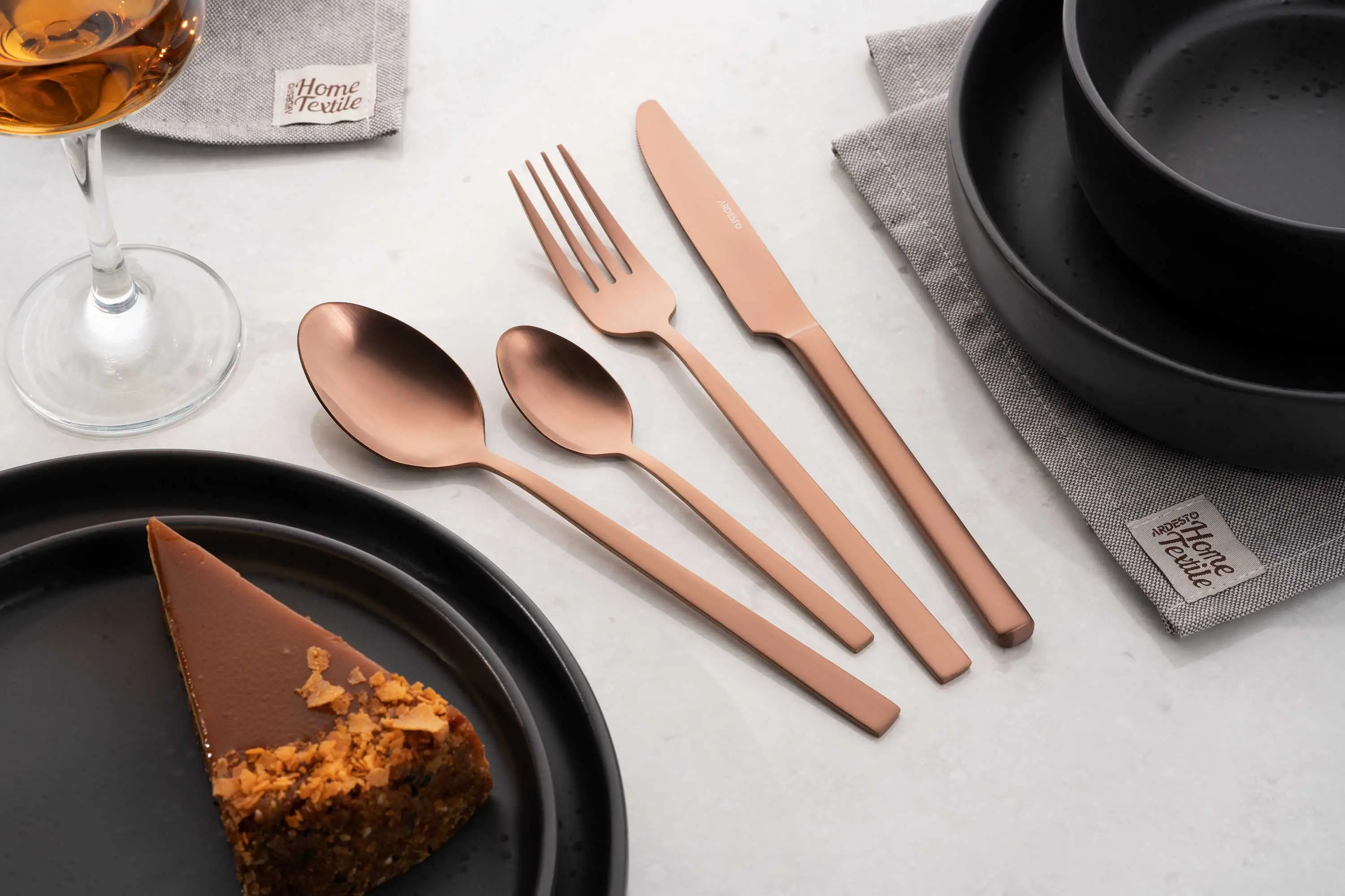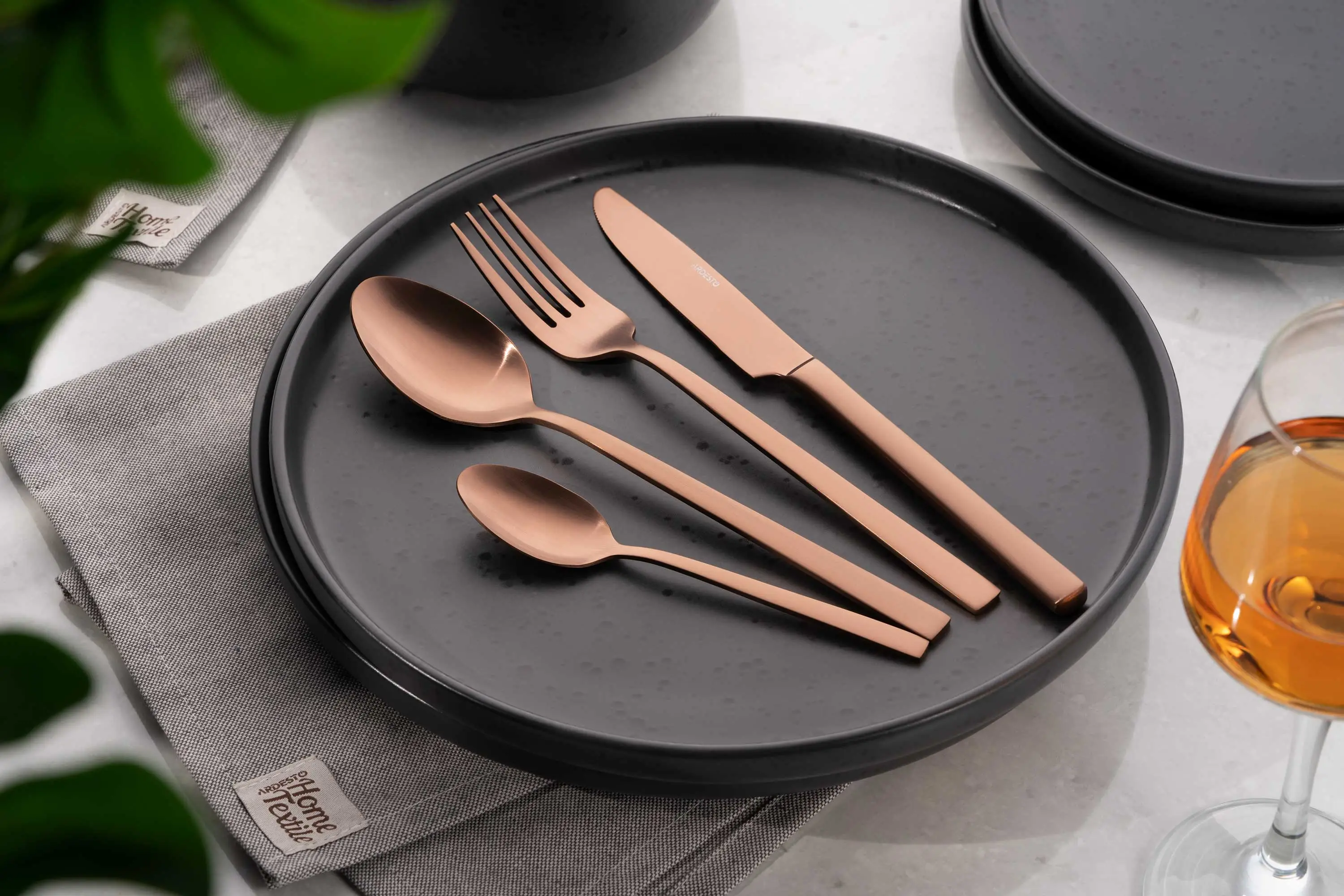 Столові прибори ARDESTO Black Mars Favola мідного матового кольору – важливі елементи сервірування столу як за щоденного використання, так і для свят. Набір складається з чотирьох предметів: столової ложки; столової виделки; столового ножа; чайної ложки. Зручні вироби виготовлено з нержавіючої сталі, яка вирізняється міцністю, гігієнічністю та стійкістю до корозії. Мають елегантний дизайн і ергономічну форму. Вироби прості в догляді – можна мити в посудомийній машині.