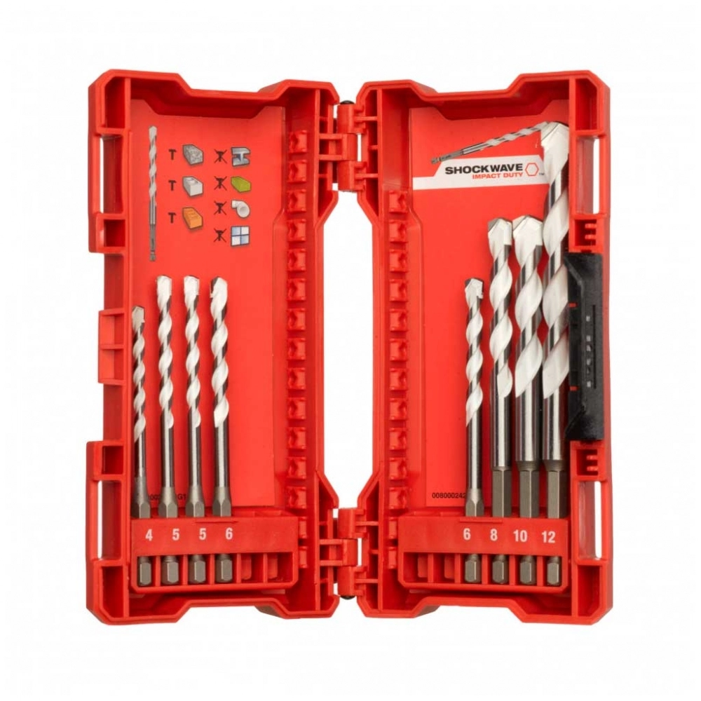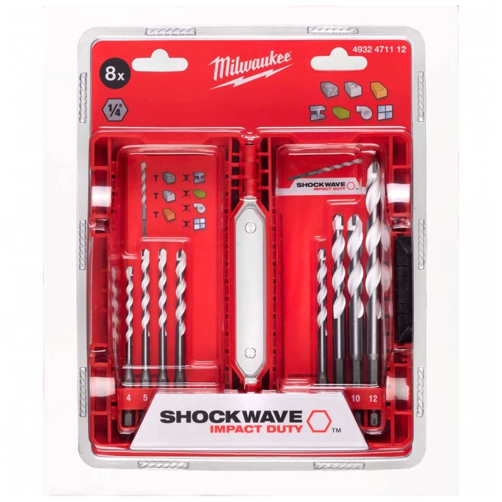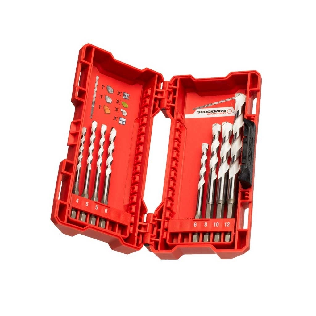 Набір свердел Milwaukee SHOCKWAVE Multi-Material Drill Bit Set складається з 8 високоякісних свердел, призначених для роботи з різними матеріалами. Цей набір забезпечує ефективне свердління в бетоні, цеглі, черепиці, тонкому металі, керамічній плитці, деревині, ПВХ, алюмінію, гіпсокартону та інших матеріалах. Двокромковий твердосплавний наконечник - забезпечує довговічність та універсальність при свердлінні в різних твердих матеріалах.