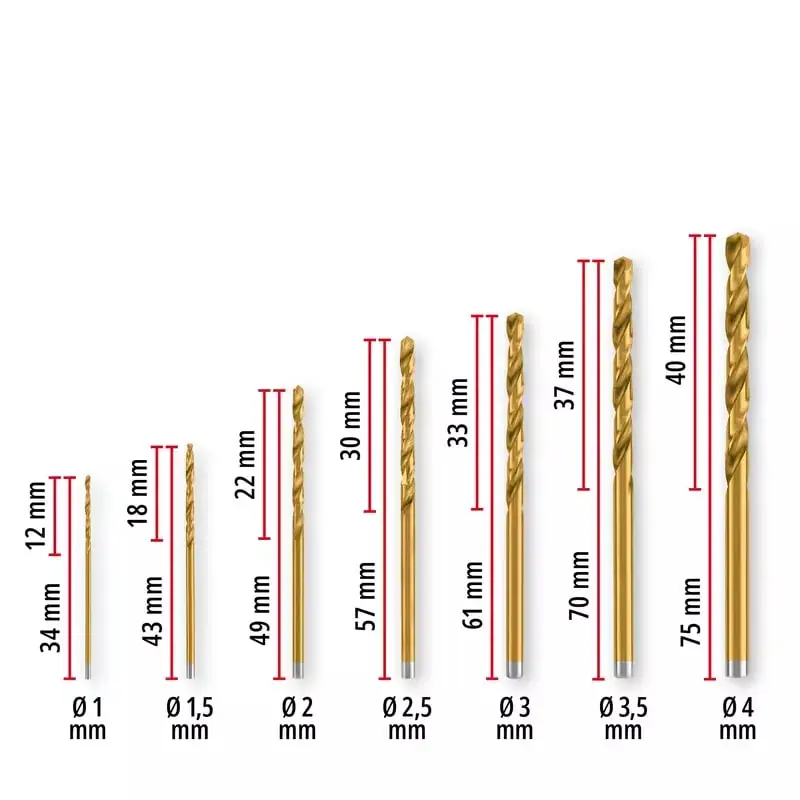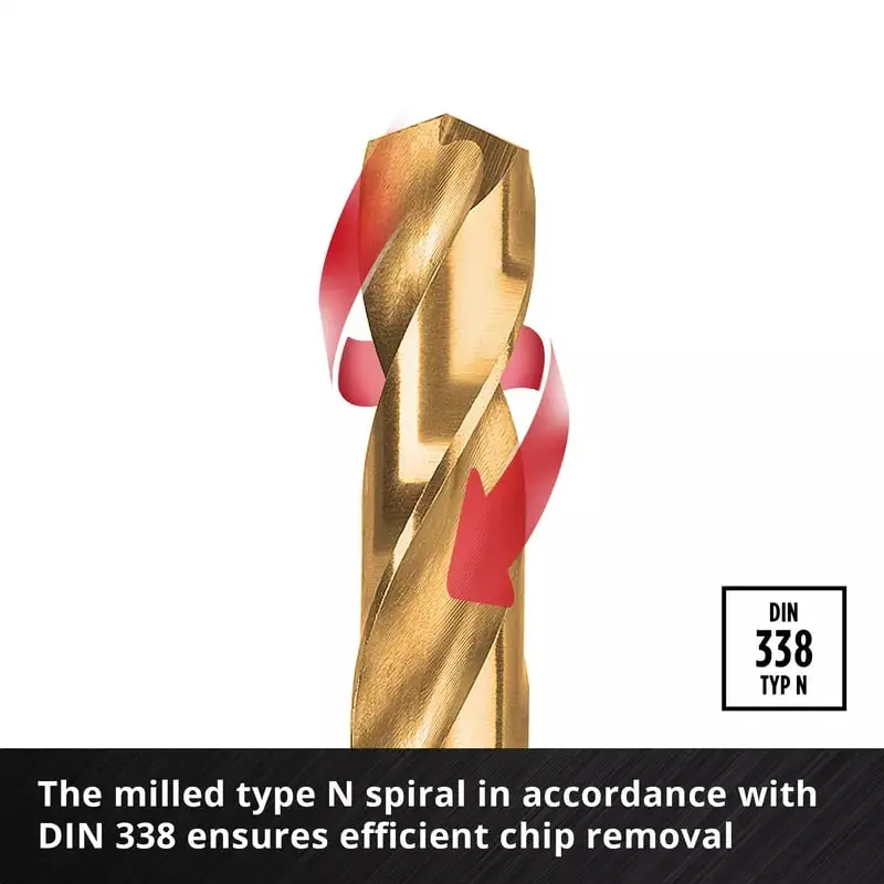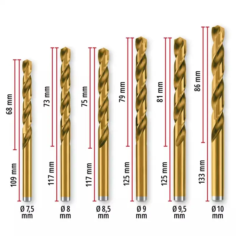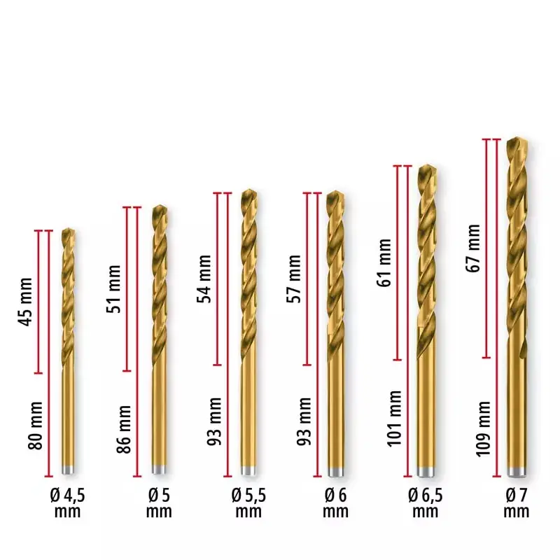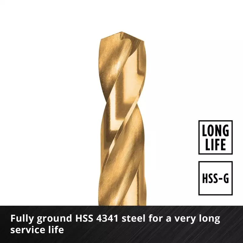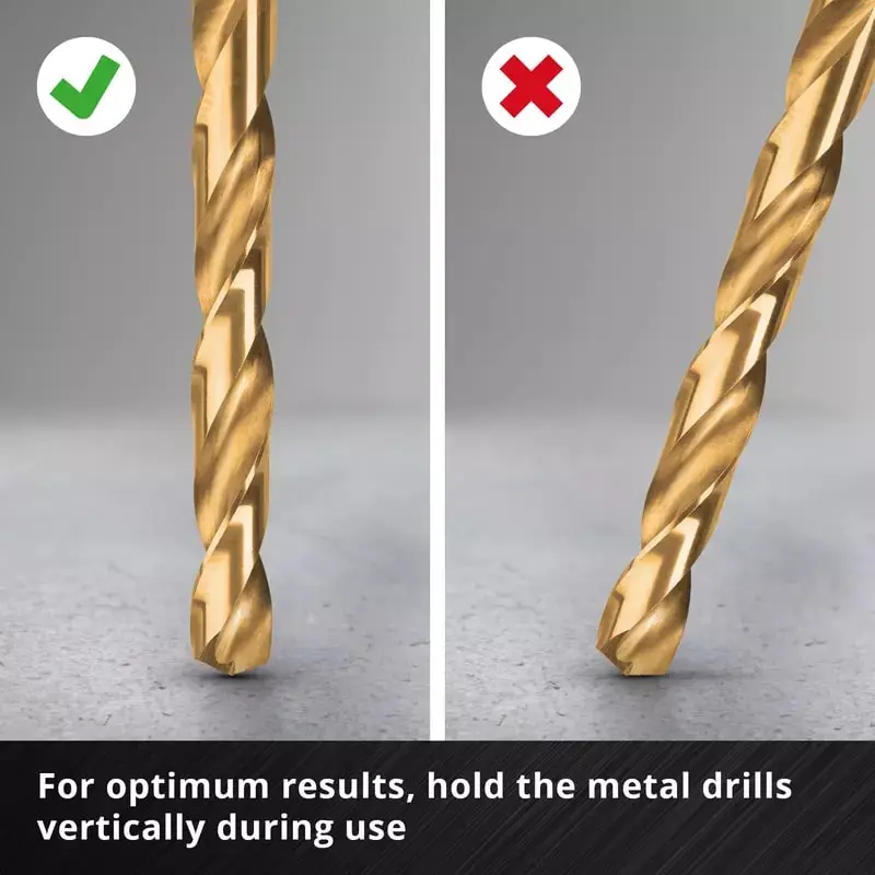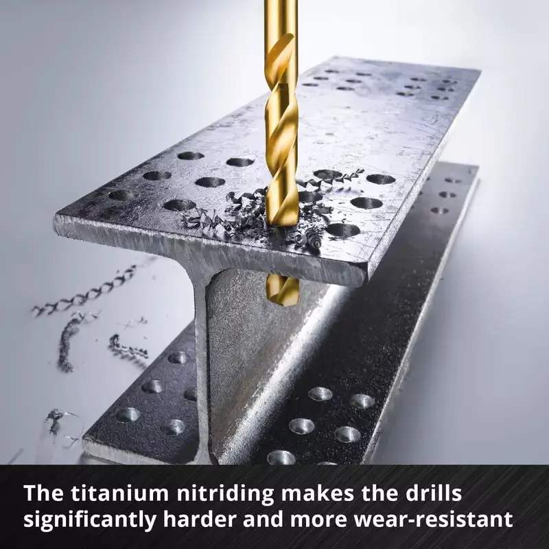 Набір свердел від Einhell, що складається з 19 шт. свердел по металу, містить свердла найпоширеніших діаметрів 1 / 1,5 / 2 / 2,5 / 3 / 3,5 / 4 / 4,5 / 5 / 5,5 / 6 / 6,5 / 7 / 7,5 / 8 / 8,5 / 9 / 9,5 / 10 мм. Свердла виготовлені з високоякісної, повністю відшліфованої швидкоріжучої сталі HSS 4341, яка відома своїми надзвичайно високими експлуатаційними характеристиками та дуже довгим терміном служби. Азотування титаном надає свердлам зі швидкоріжучої сталі підвищену твердість і зносостійкість, а також золотистий колір.