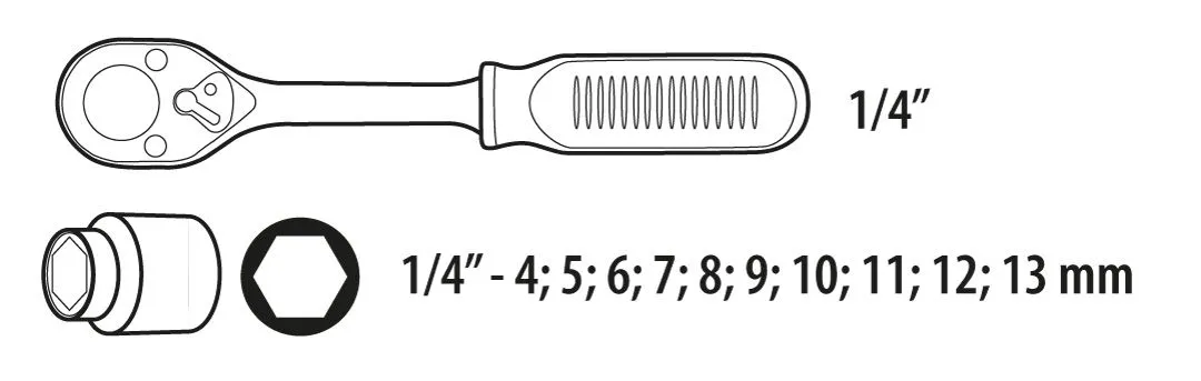 - Розміри торцевих голівок/ключів 7 мм; 8 мм; 9 мм; 10 мм; 11 мм; 12 мм; 4 мм; 5 мм;