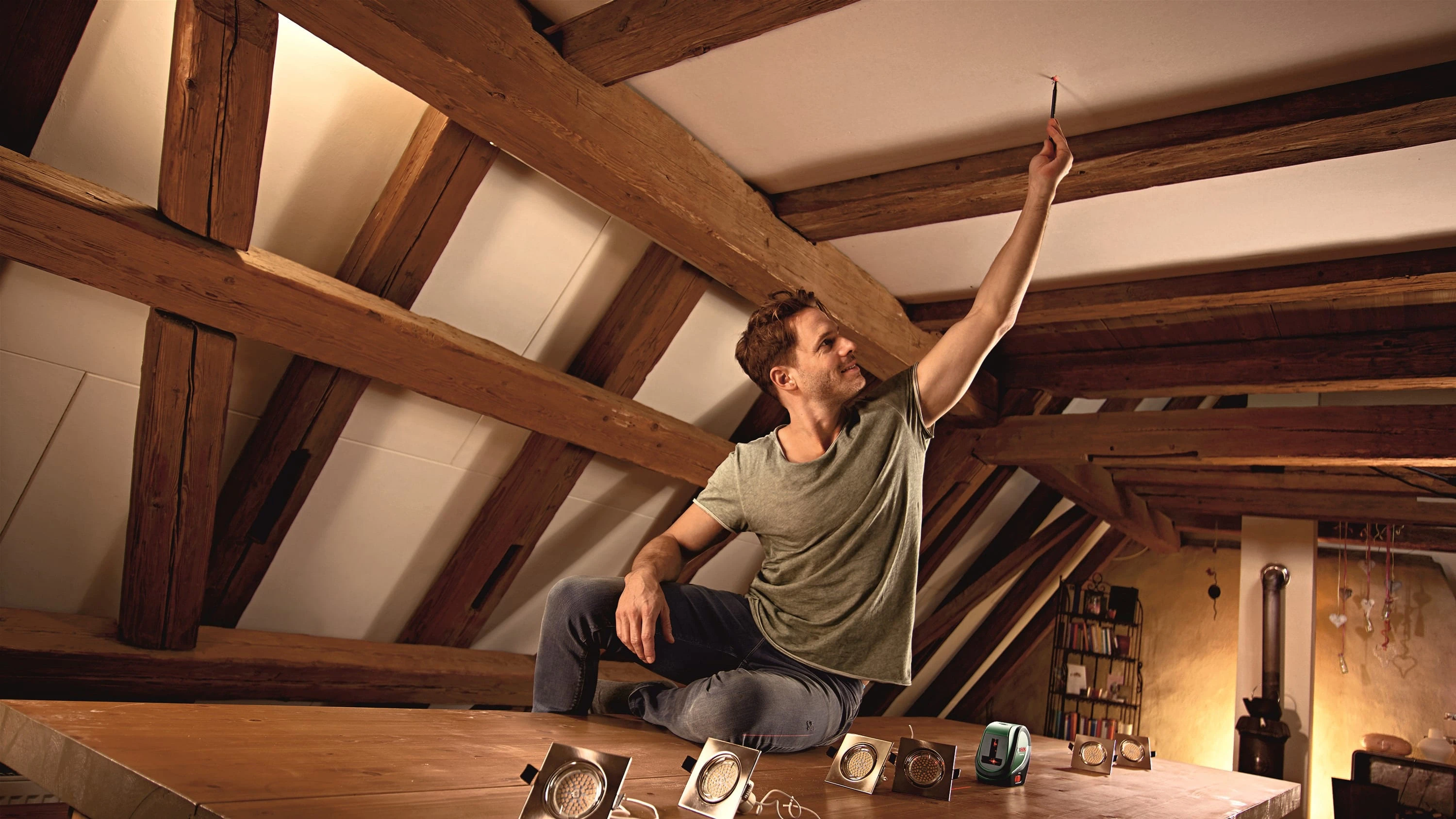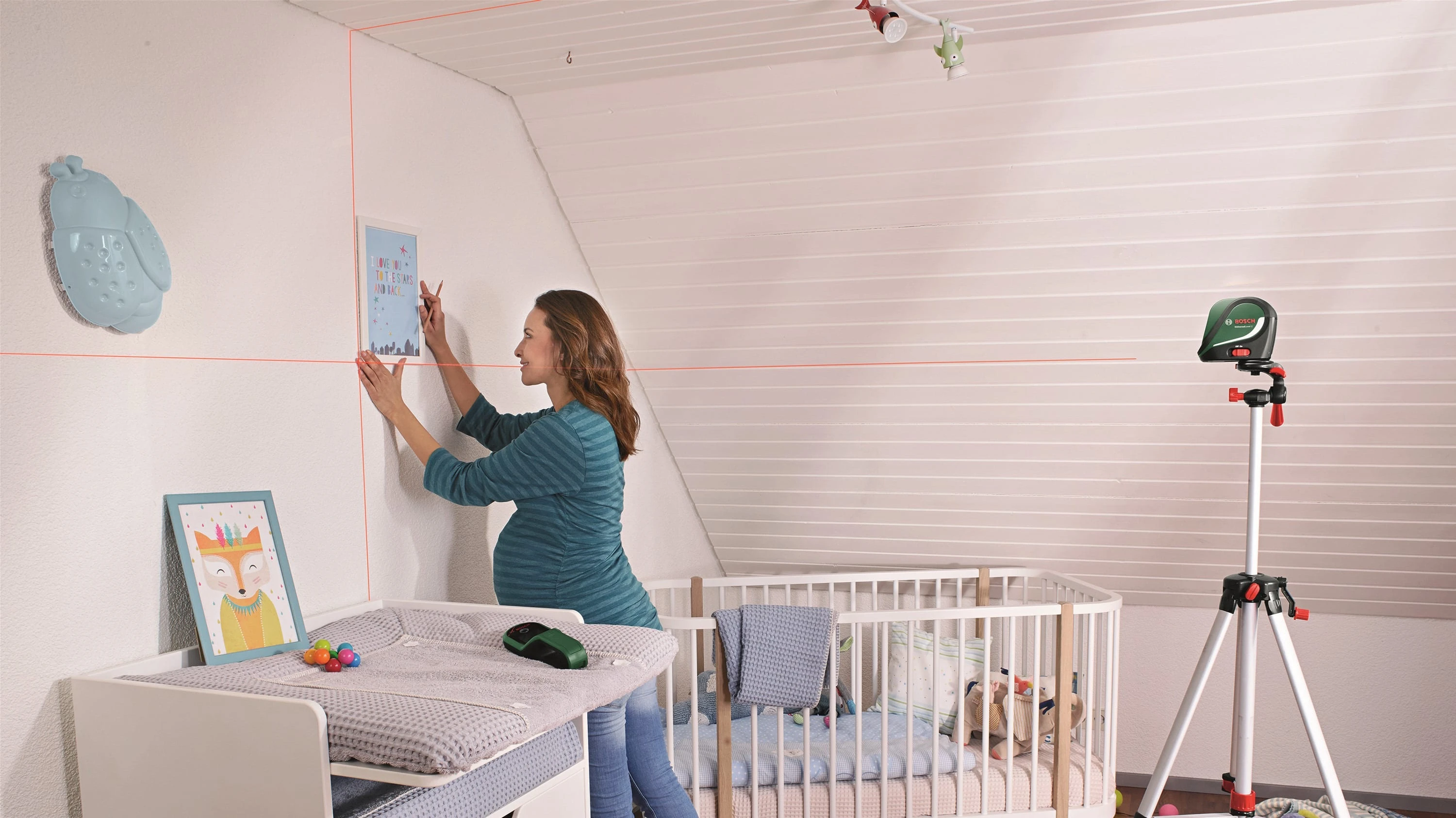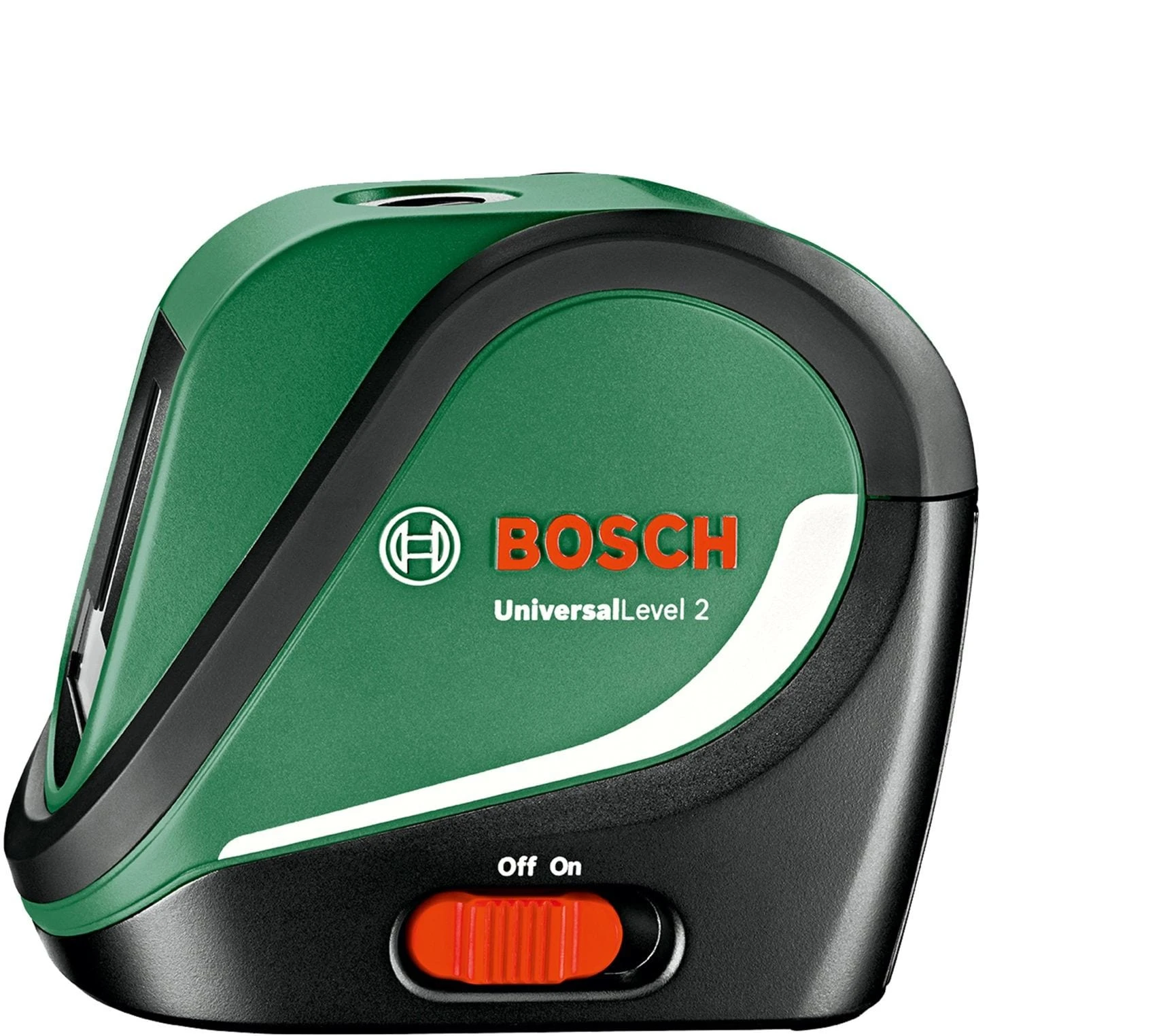 Bosch UniversalLevel2 - це простий і зручний лазерний нівелір, який ідеально підходить для домашнього використання. Він проєктує горизонтальну і вертикальну лінії, які допоможуть вам вирівняти картини, полиці, меблі та інші предмети.